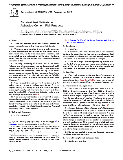This test method covers asbestos-cement flat sheets, roofing shingles, siding shingles, and clapboards. Each test specimen should be cut to specification without cracks and damage. This test method details the significance and use of routine test procedures for flexural strength, deflection, water absorption, and dimensions.