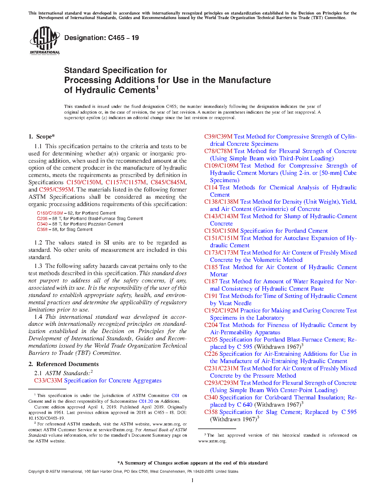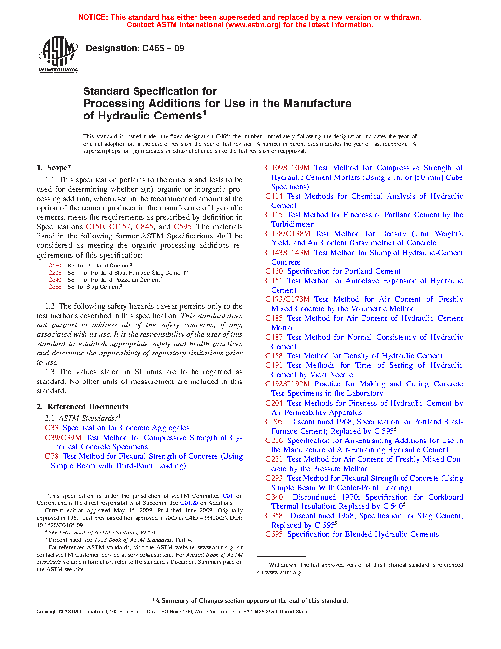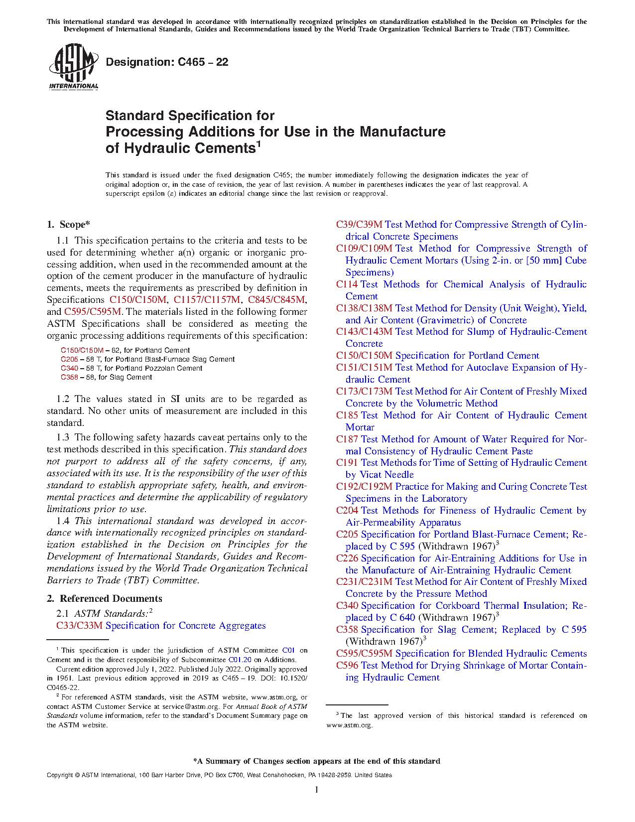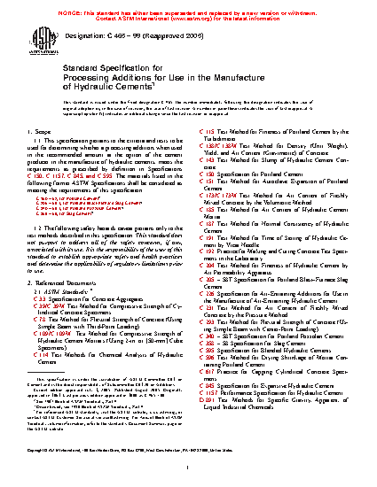 1.1 This specification pertains to the criteria and tests to be used for determining whether a(n) organic or inorganic processing addition, when used in the recommended amount at the option of the cement producer in the manufacture of hydraulic cements, meets the requirements as prescribed by definition in Specifications C150, C1157, C845, and C595. The materials listed in the following former ASTM Specifications shall be considered as meeting the organic processing additions requirements of this specification: