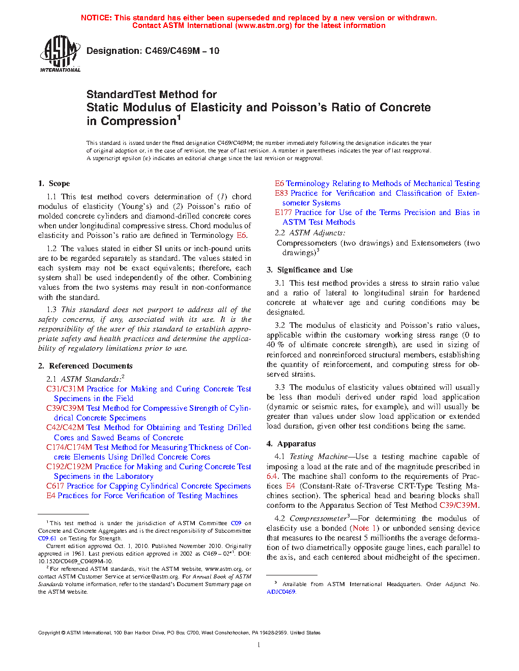 1.1 This test method covers determination of (1) chord modulus of elasticity (Young's) and (2) Poisson's ratio of molded concrete cylinders and diamond-drilled concrete cores when under longitudinal compressive stress. Chord modulus of elasticity and Poisson's ratio are defined in Terminology E6.