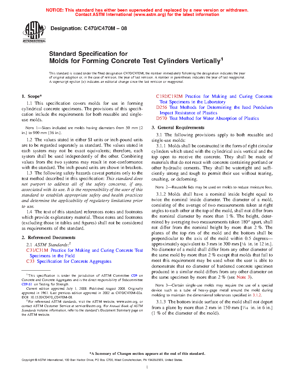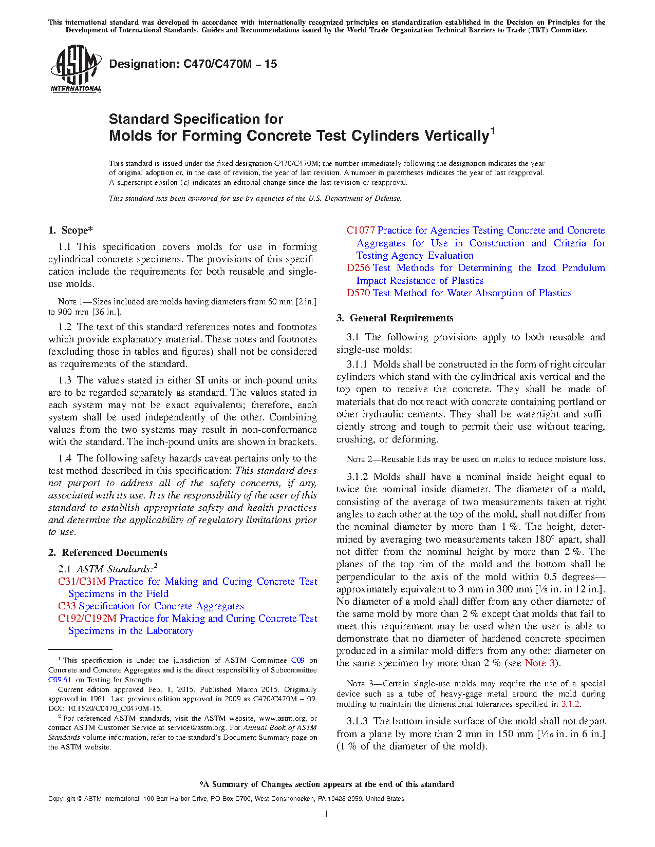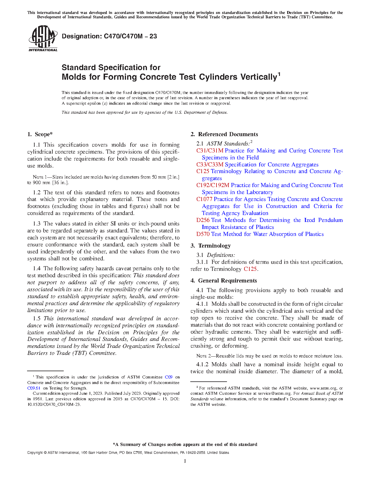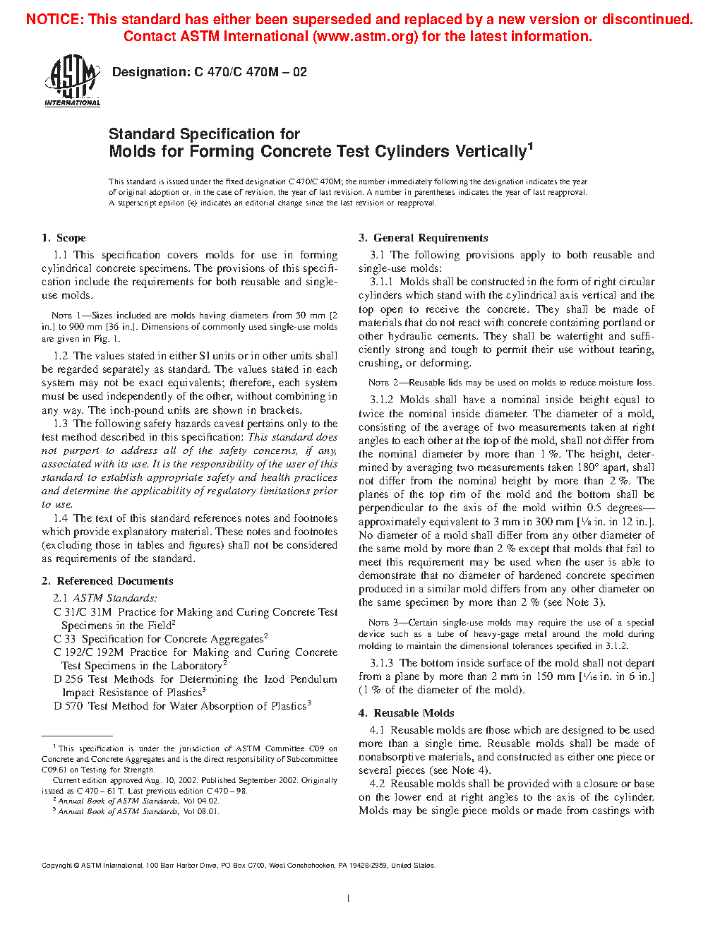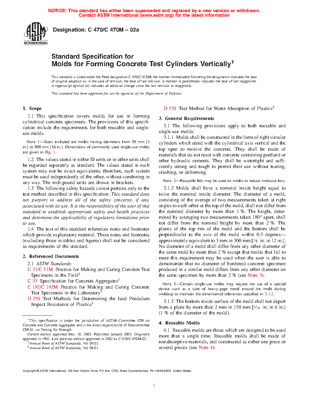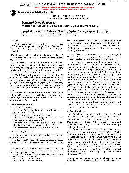 1.1 This specification covers molds for use in forming cylindrical concrete specimens. The provisions of this specification include the requirements for both reusable and single-use molds.