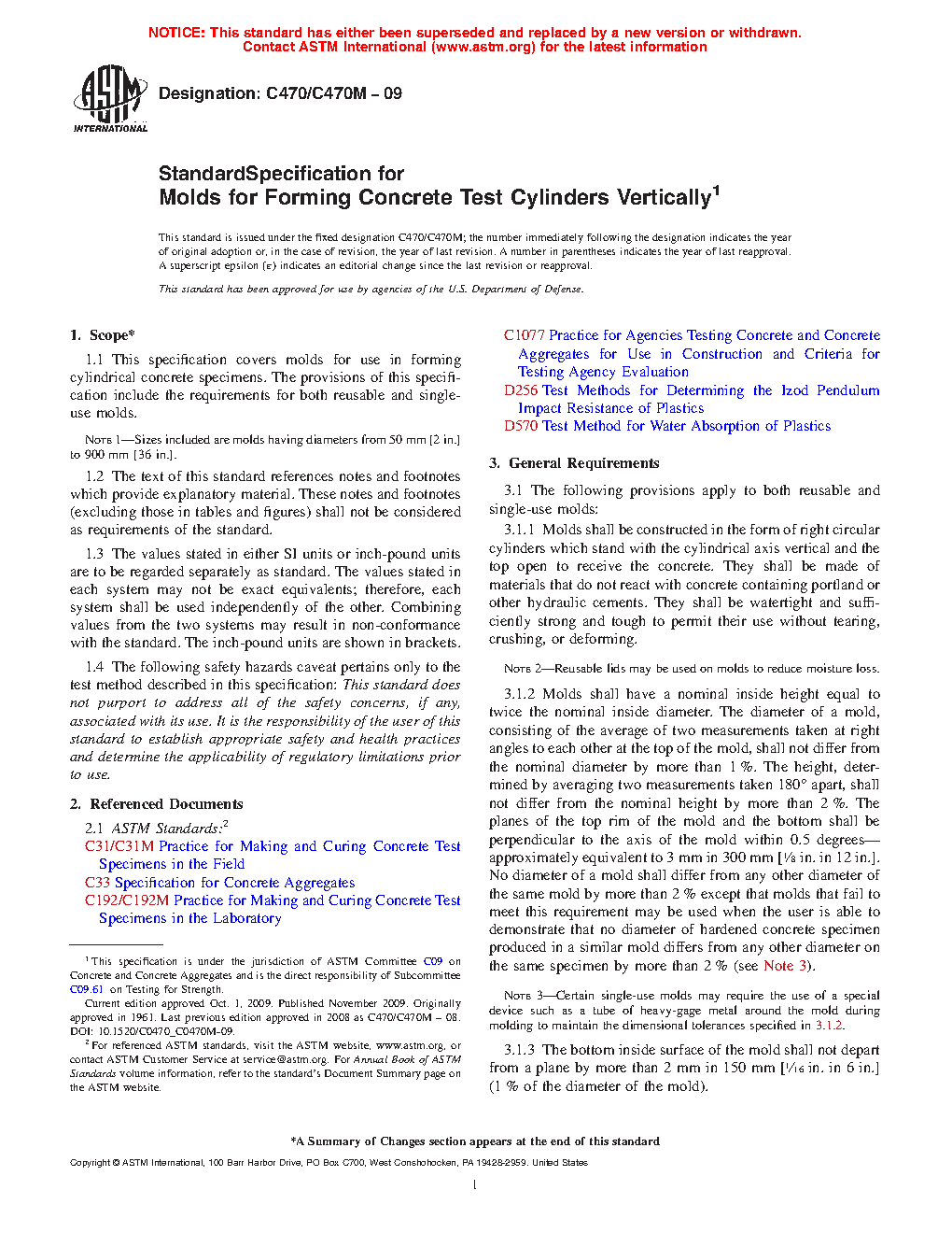 1.1 This specification covers molds for use in forming cylindrical concrete specimens. The provisions of this specification include the requirements for both reusable and single-use molds.