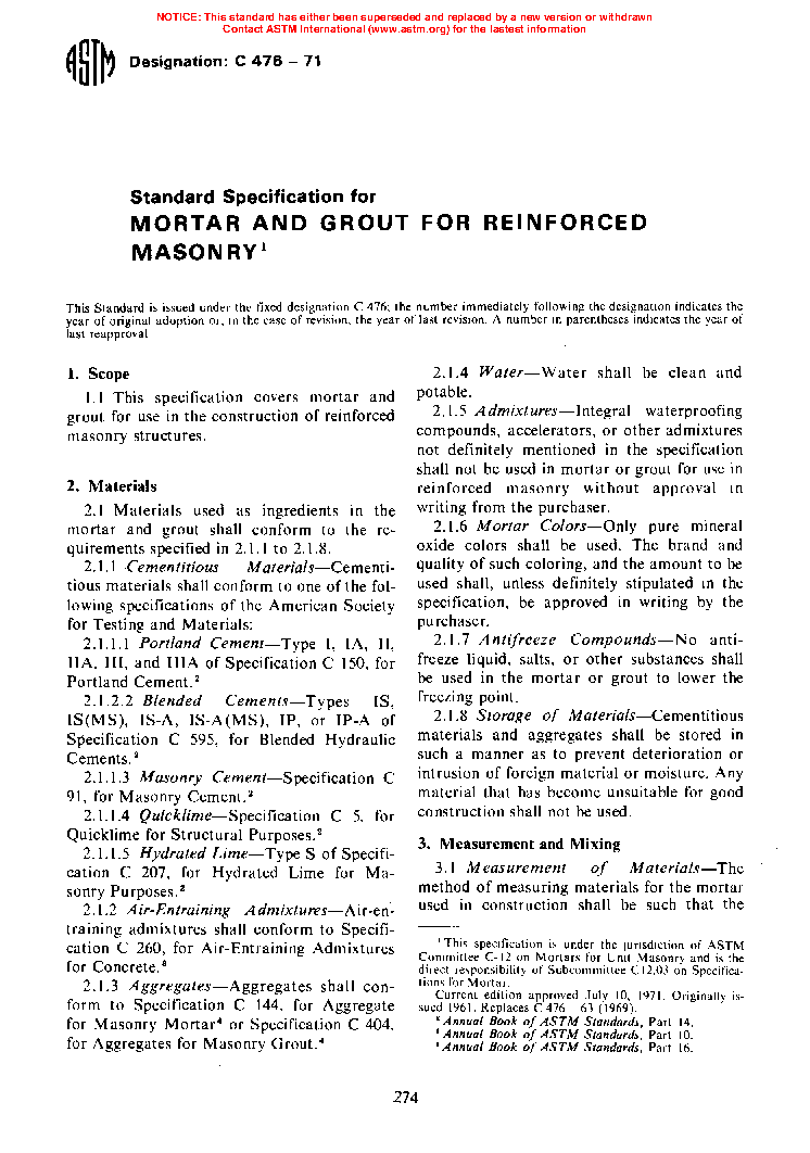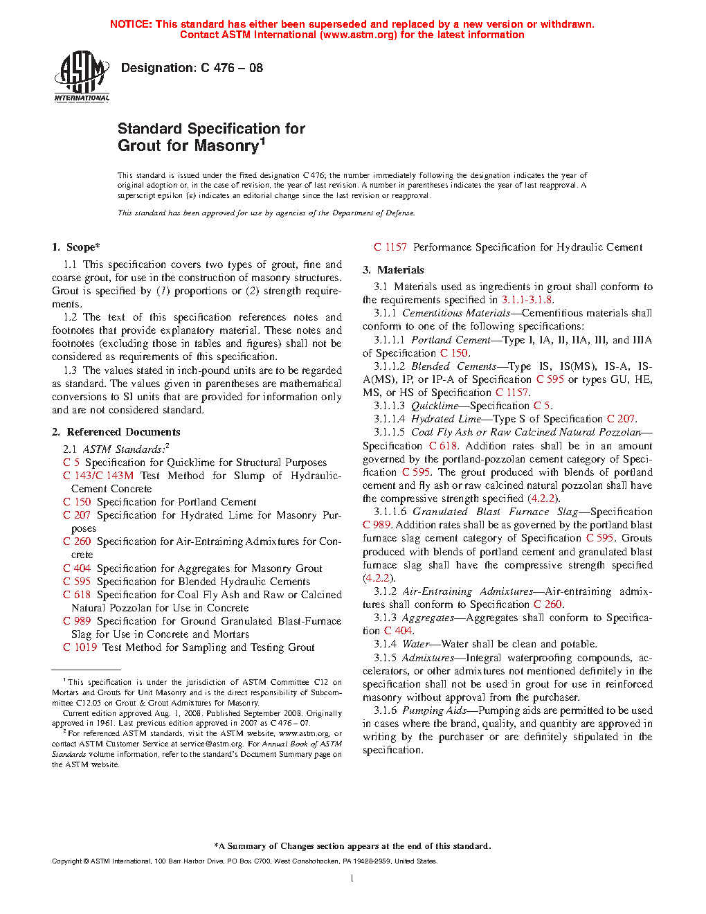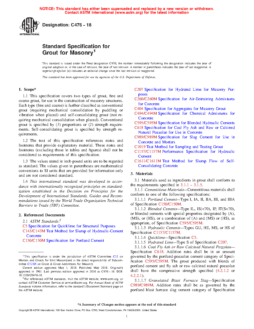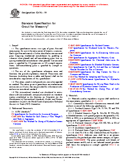 1.1 This specification covers two types of grout, fine and coarse grout, for use in the construction of masonry structures. Each type (fine and coarse) is further classified as conventional grout (requiring mechanical consolidation by puddling or vibration when placed) and self-consolidating grout (not requiring mechanical consolidation when placed). Conventional grout is specified by (1) proportions or (2) strength requirements. Self-consolidating grout is specified by strength requirements.