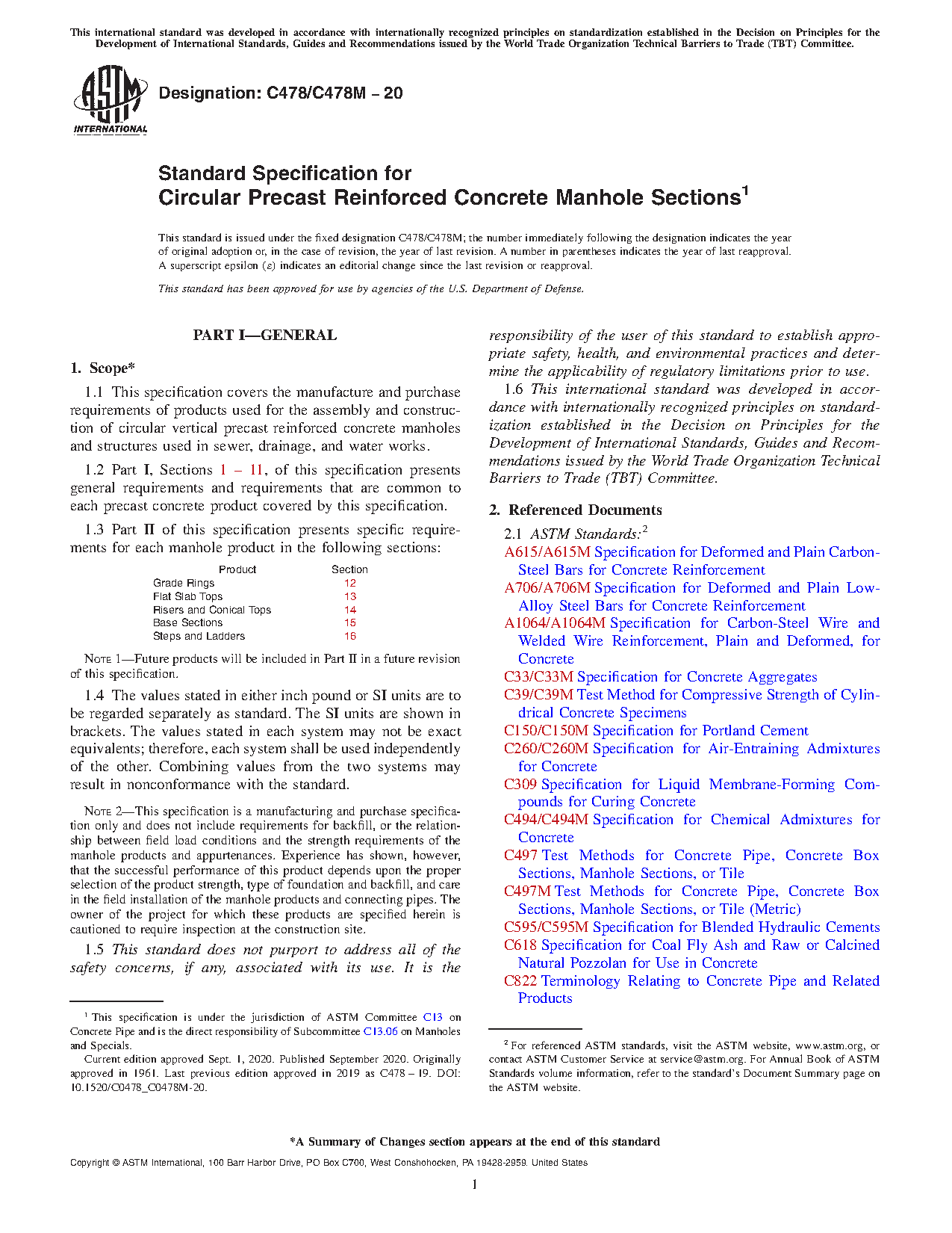 1.2 Part I, Sections 1 – 11, of this specification presents general requirements and requirements that are common to each precast concrete product covered by this specification.