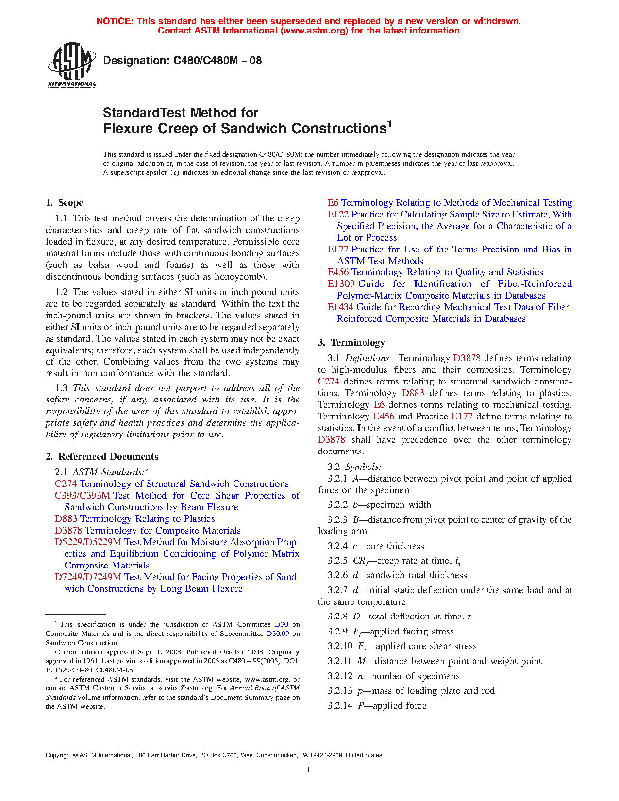 1.1 This test method covers the determination of the creep characteristics and creep rate of flat sandwich constructions loaded in flexure, at any desired temperature. Permissible core material forms include those with continuous bonding surfaces (such as balsa wood and foams) as well as those with discontinuous bonding surfaces (such as honeycomb).