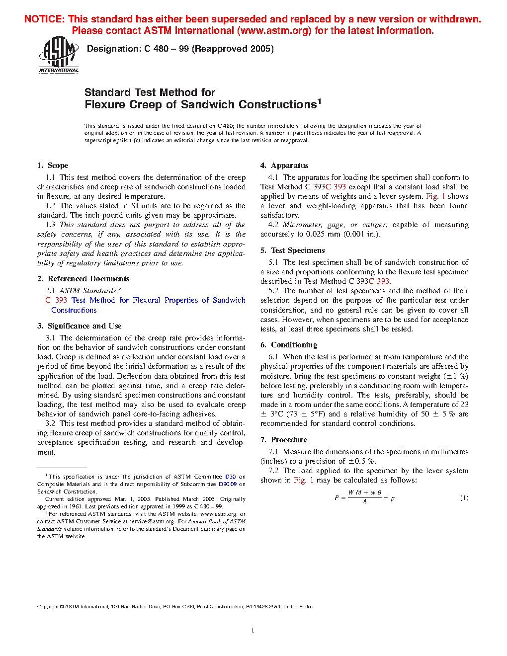 1.1 This test method covers the determination of the creep characteristics and creep rate of flat sandwich constructions loaded in flexure, at any desired temperature. Permissible core material forms include those with continuous bonding surfaces (such as balsa wood and foams) as well as those with discontinuous bonding surfaces (such as honeycomb).