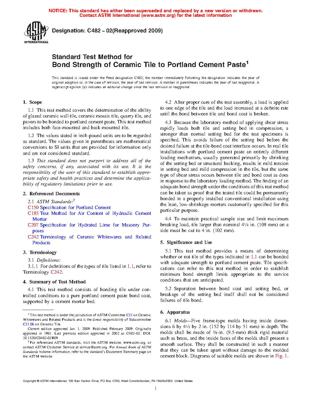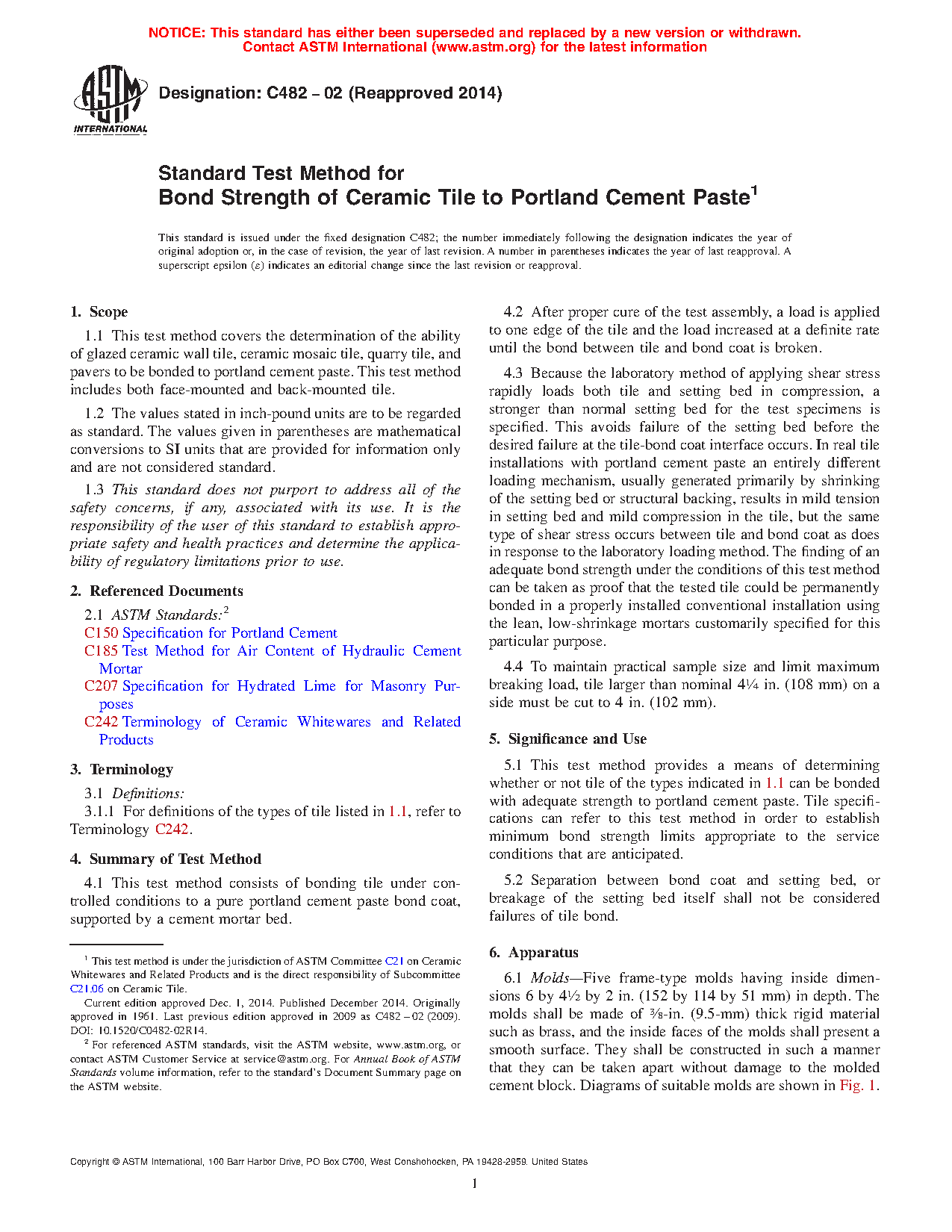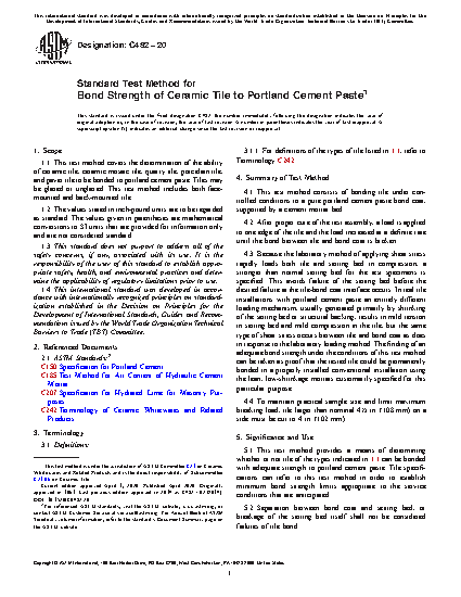 1.1 This test method covers the determination of the ability of ceramic tile, ceramic mosaic tile, quarry tile, porcelain tile, and paver tile to be bonded to portland cement paste. Tiles may be glazed or unglazed. This test method includes both face-mounted and back-mounted tile.