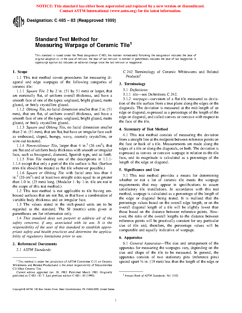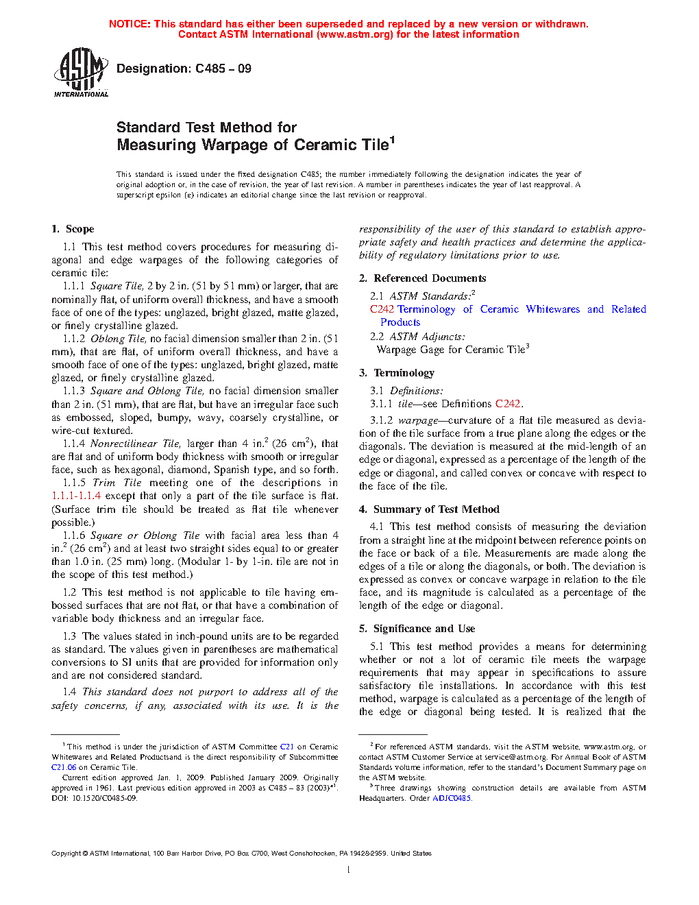 1.1 This test method covers procedures for measuring the corner, diagonal, and edge warpages of the following categories of ceramic tile: