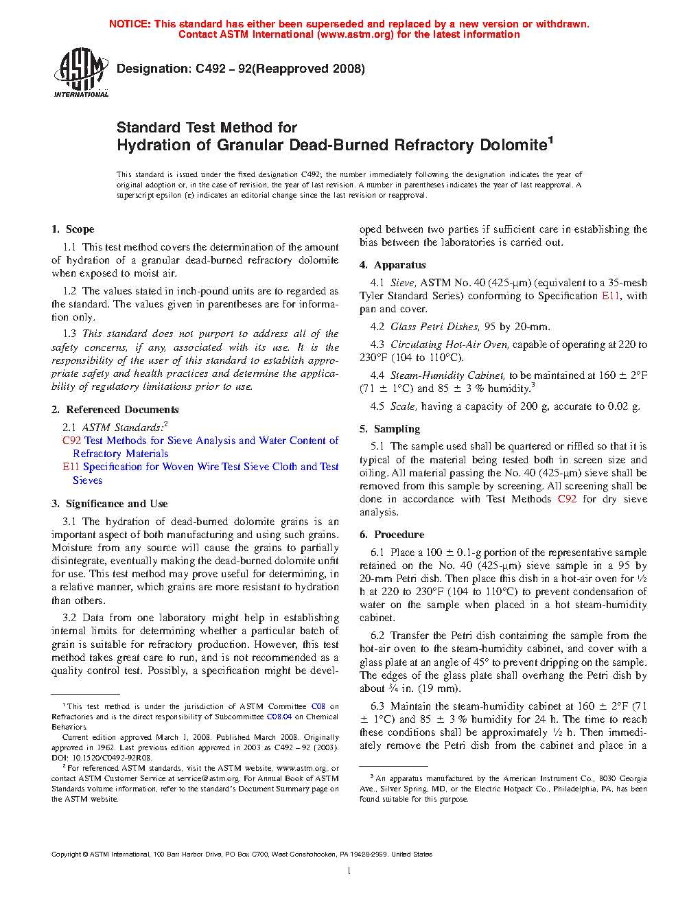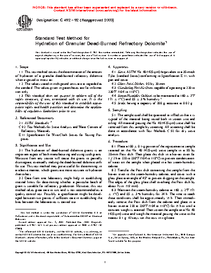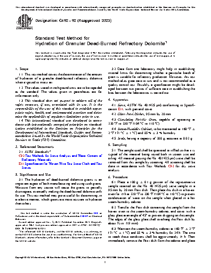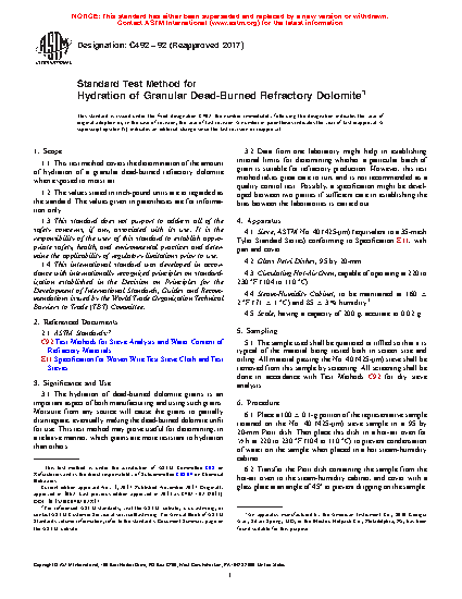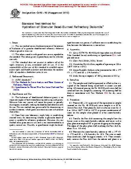 1.1 This test method covers the determination of the amount of hydration of a granular dead-burned refractory dolomite when exposed to moist air.