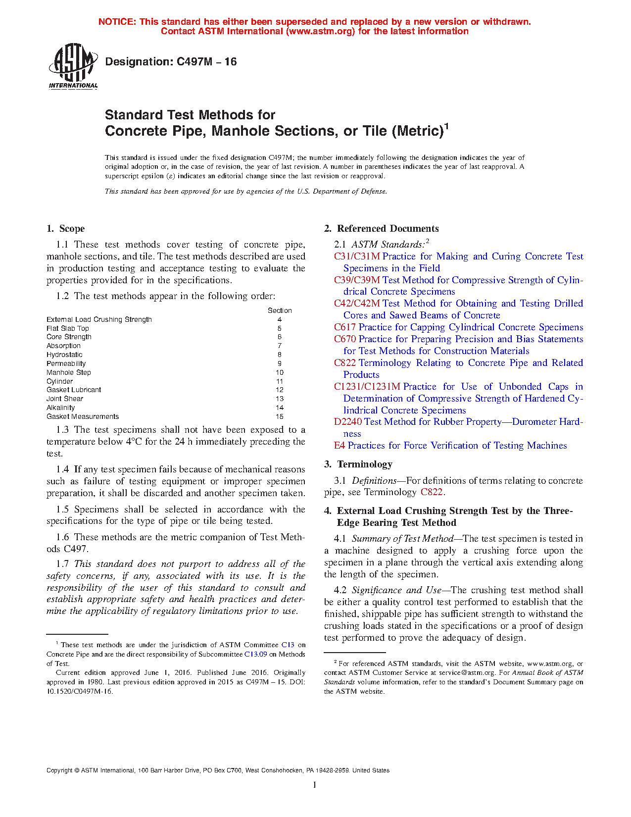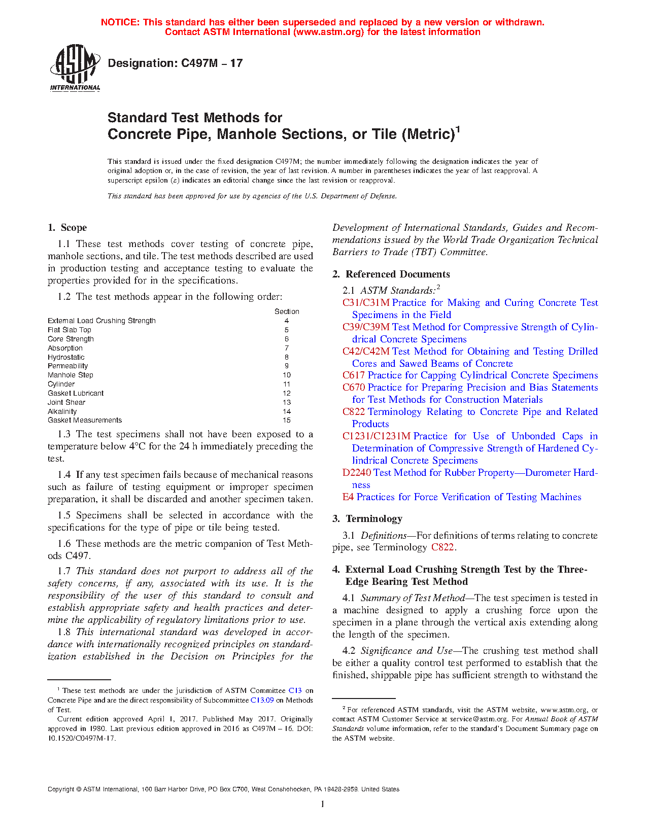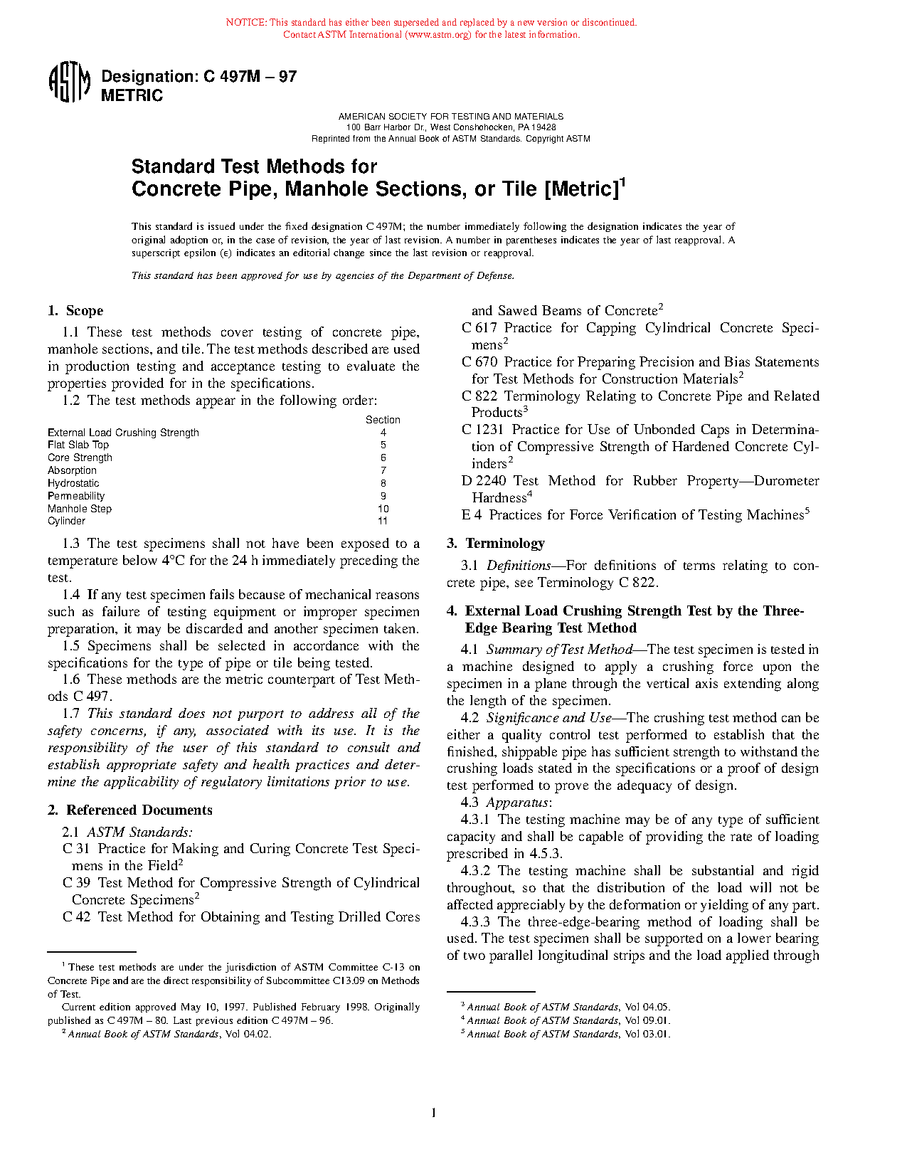 These test methods cover production and acceptance tests for concrete pipes, manhole sections, and tiles. Tests include procedures for evaluating external load crushing strength, flat slab top, core strength, absorption, hydrostatic, permeability, manhole step, cylinder, gasket lubricant, joint shear, alkalinity, and gasket measurements. Aside from the procedures, this standard also details the significance and use of and the required test apparatus for each test.