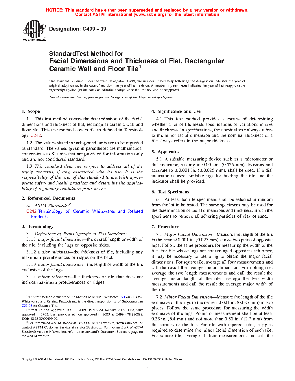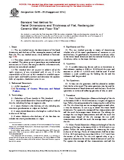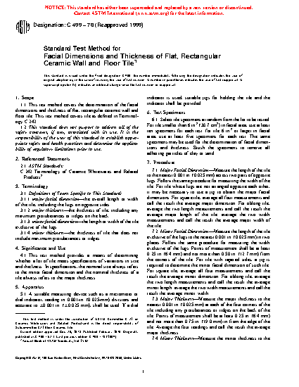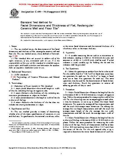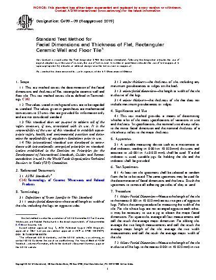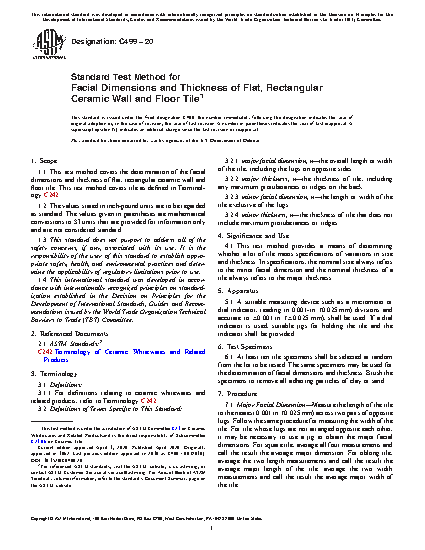 1.1 This test method covers the determination of the facial dimensions and thickness of flat, rectangular ceramic wall and floor tile. This test method covers tile as defined in Terminology C242.
