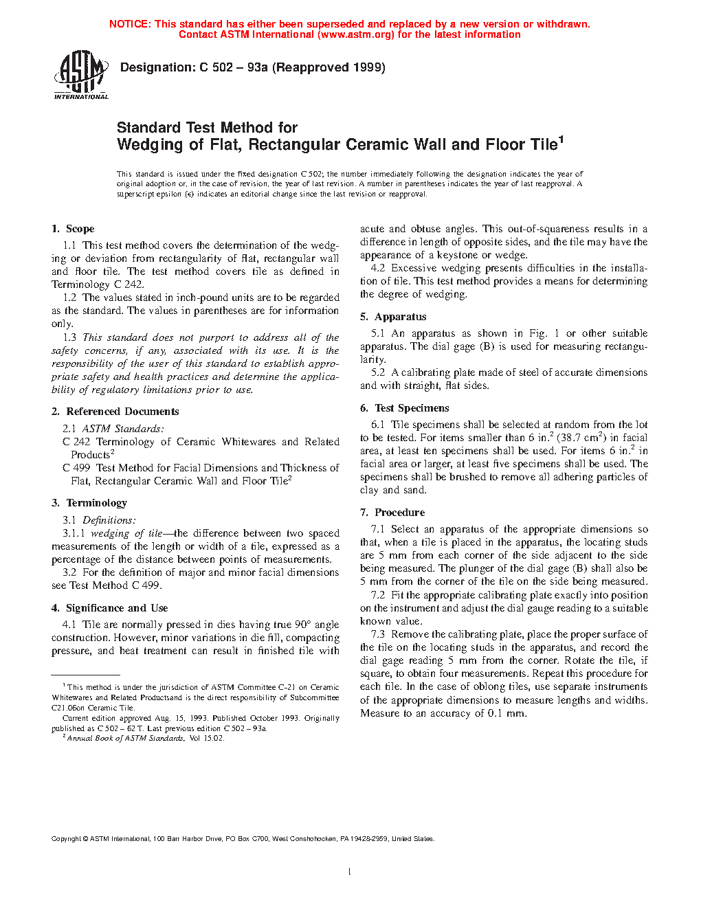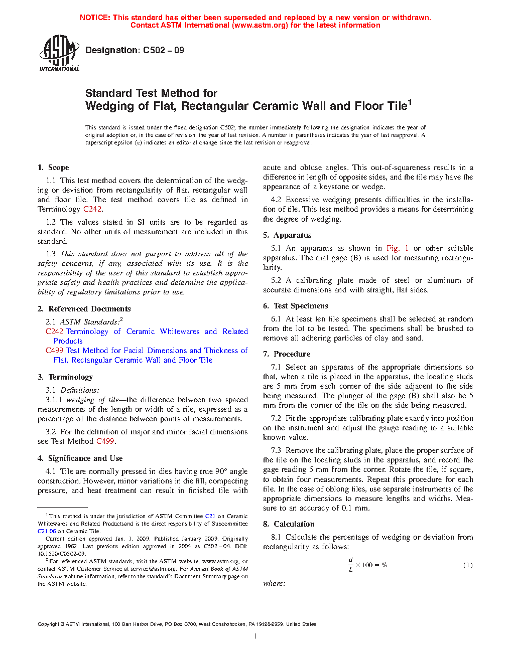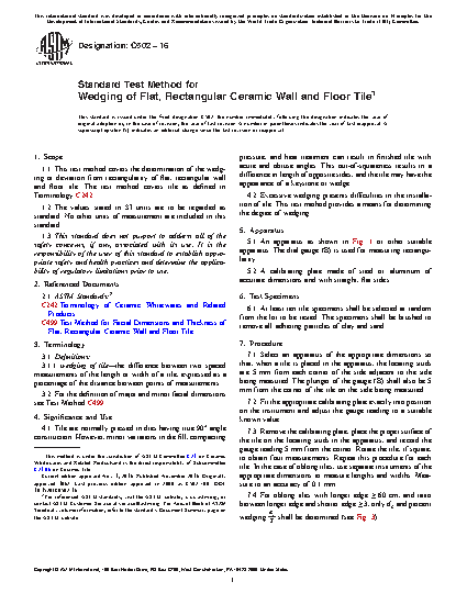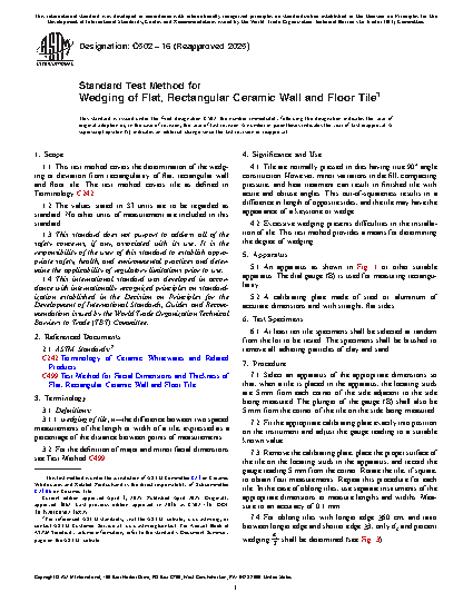 1.1 This test method covers the determination of the wedging or deviation from rectangularity of flat, rectangular wall and floor tile. The test method covers tile as defined in Terminology C242.