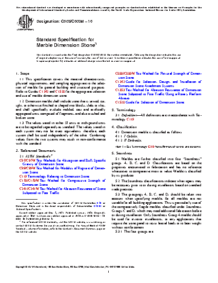 1.1 This specification covers the material characteristics, physical requirements, and sampling appropriate to the selection of marble for general building and structural purposes. Refer to Guides C1242 and C1528 for the appropriate selection and use of marble dimension stone.