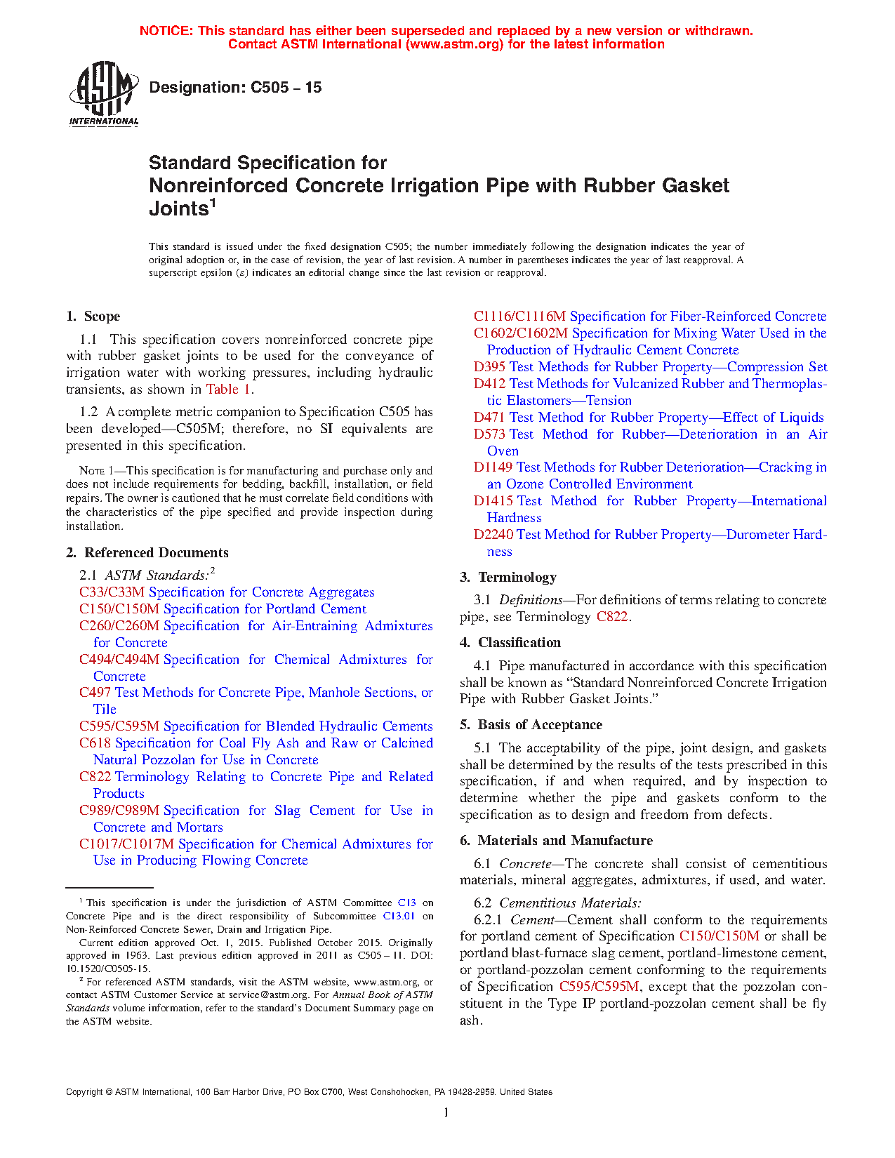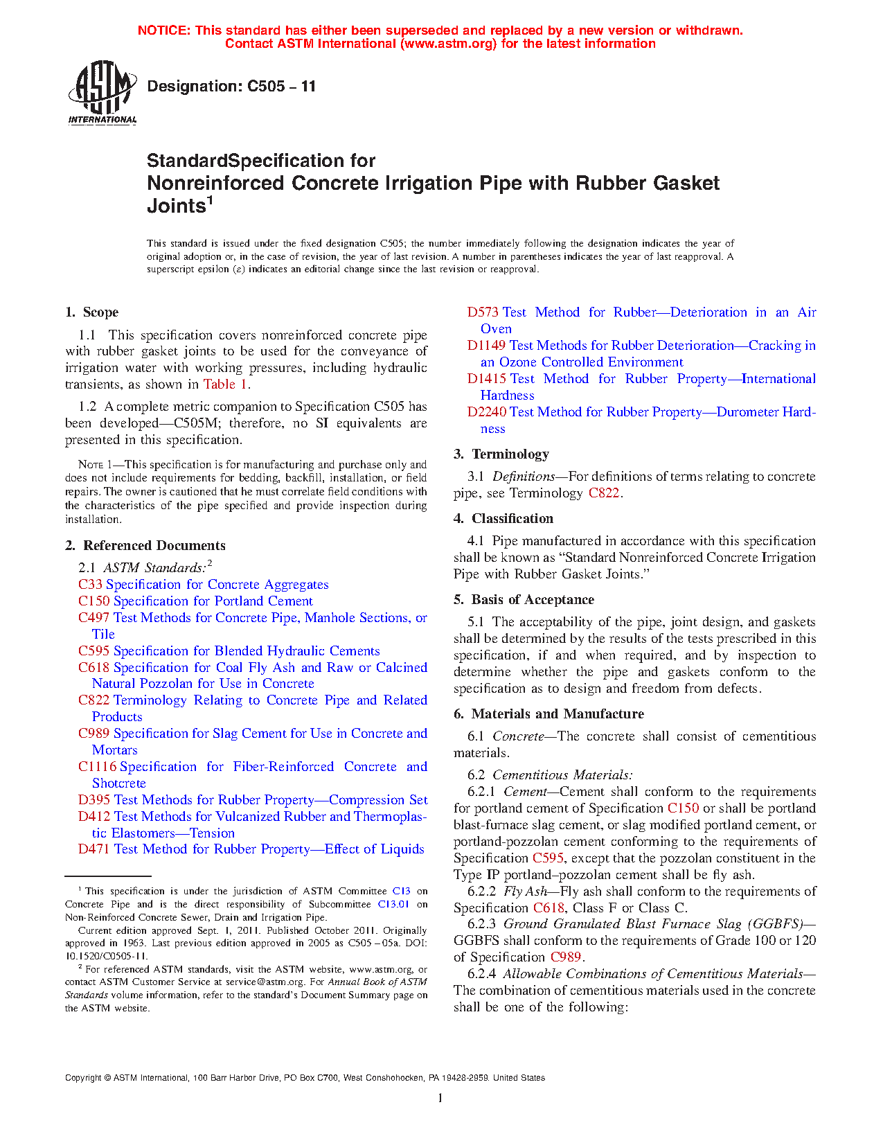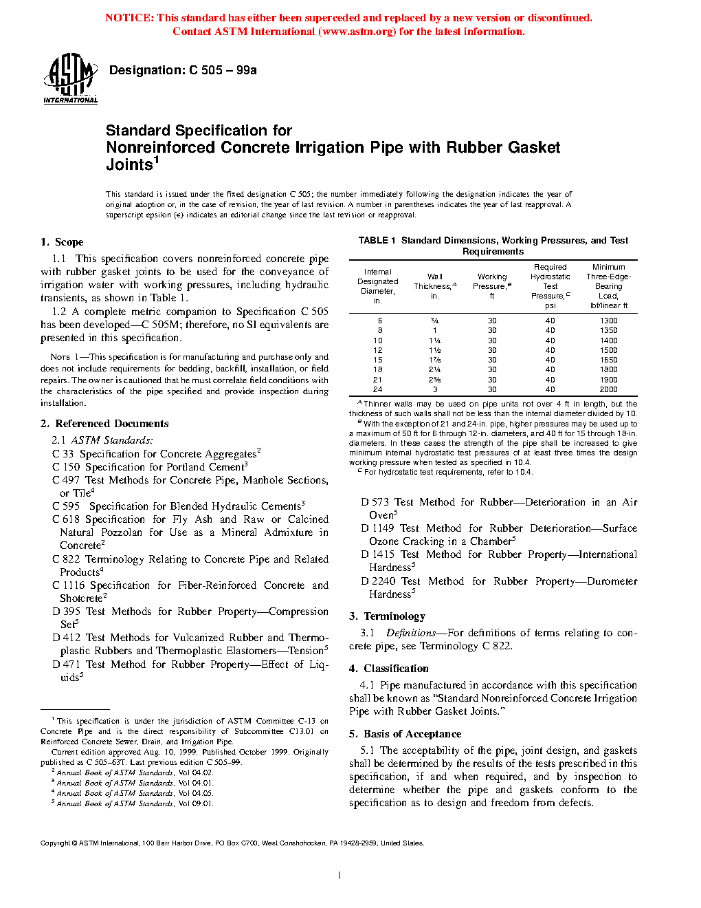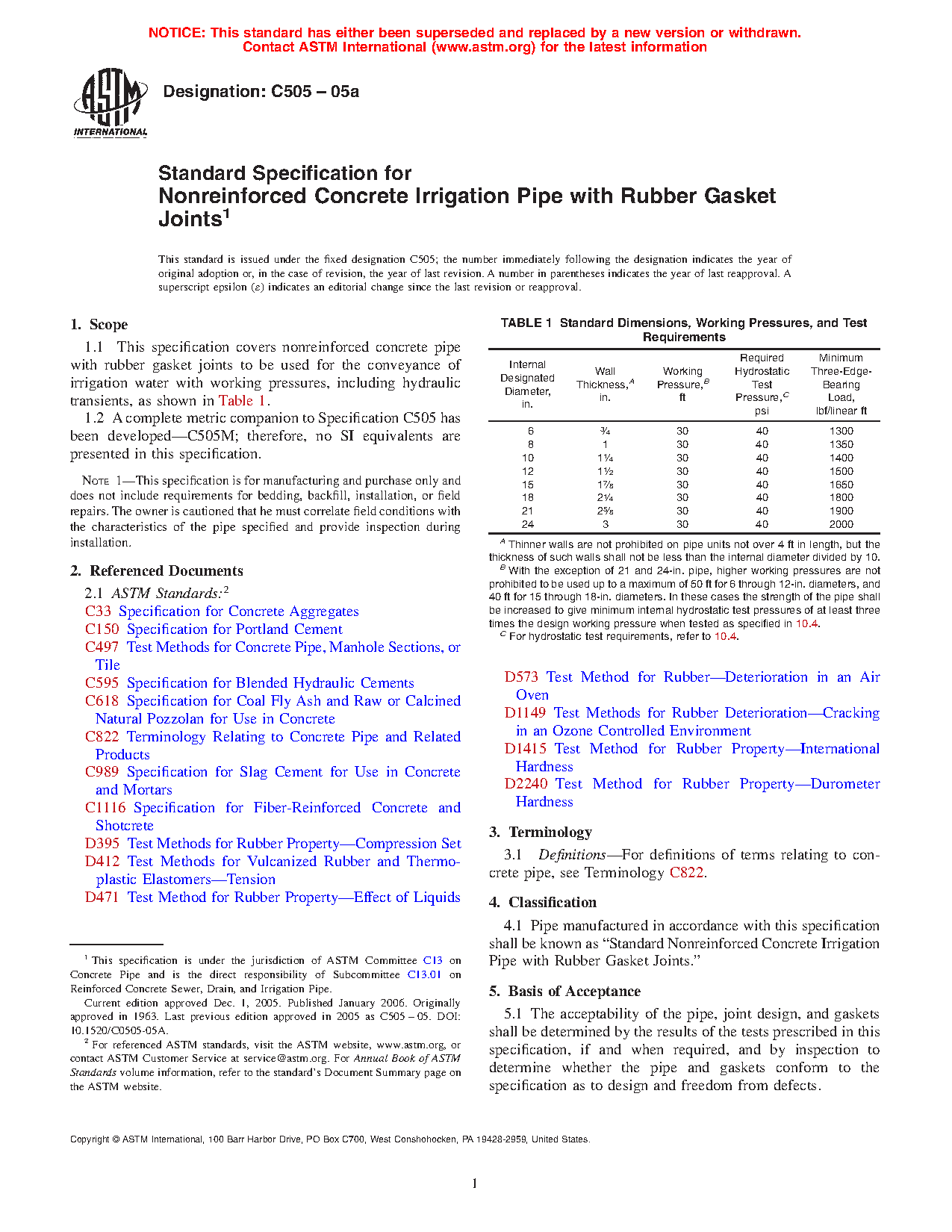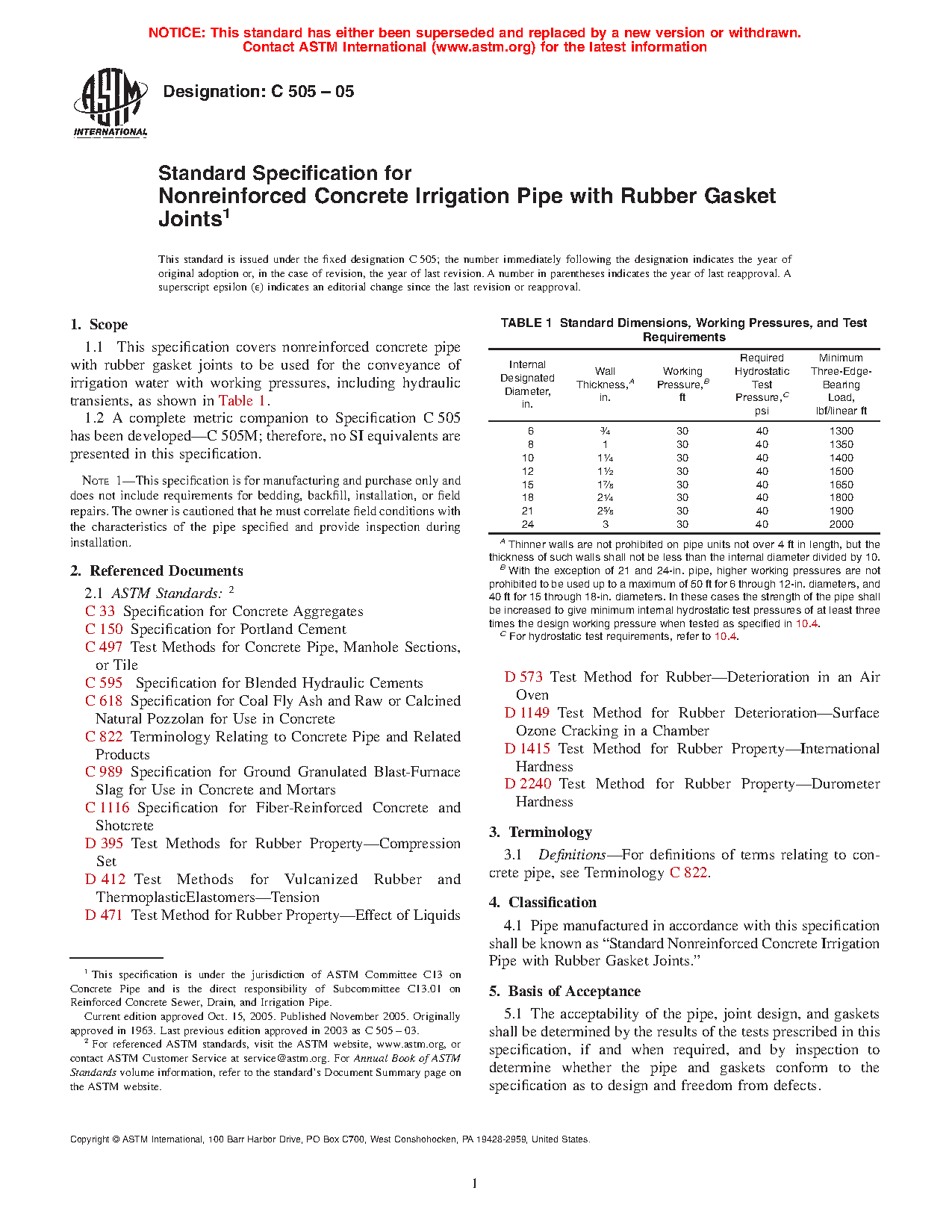 1.1 This specification covers nonreinforced concrete pipe with rubber gasket joints to be used for the conveyance of irrigation water with working pressures, including hydraulic transients, as shown in Table 1.