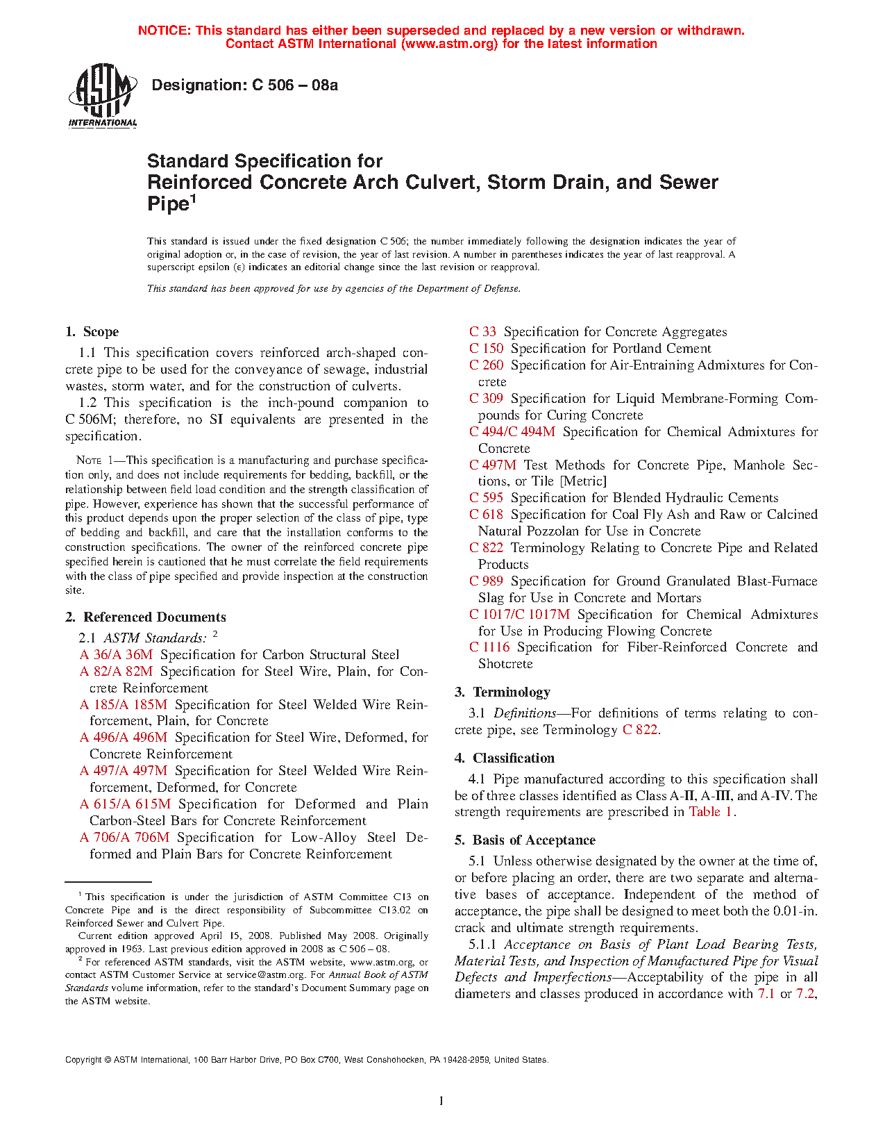 This specification covers reinforced arch-shaped concrete pipe to be used for the conveyance of sewage, industrial wastes, storm water, and for the construction of culverts. Pipe manufactured according to this specification shall be of three classes identified as Class A-II, A-III, and A-IV. The reinforced concrete shall consist of cementitious materials, mineral aggregates, and water, in which steel has been embedded in such a manner that the steel and concrete act together. The pipe shall be designed to meet both the 0.01 in. crack and ultimate strength requirements determined by conducting plant load bearing tests, material tests, and inspection of manufactured pipe for visual defects and imperfections. The reinforcement, joint, and manufacture are detailed.