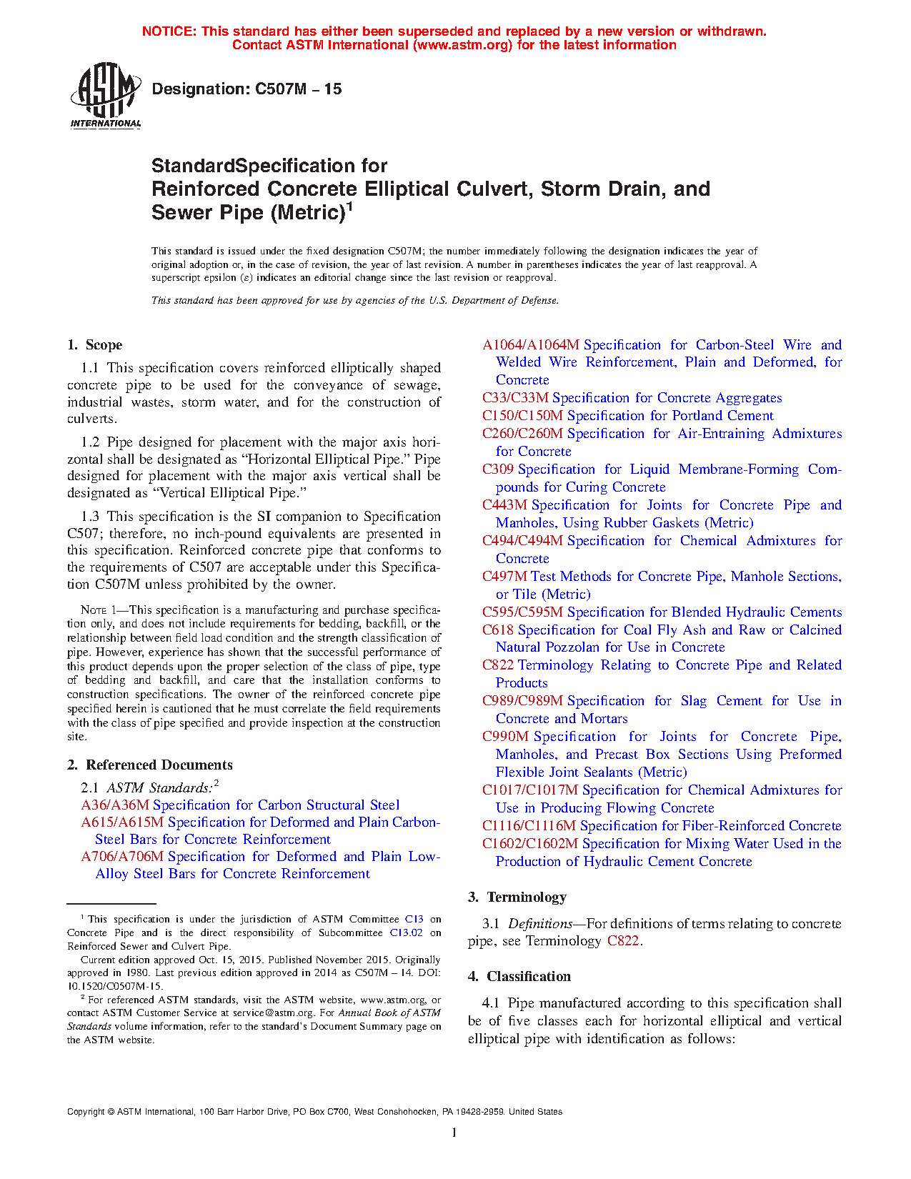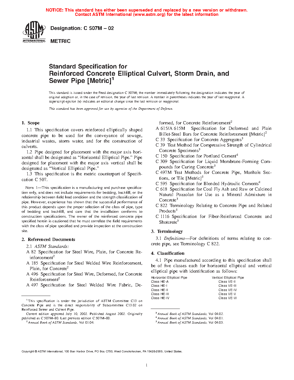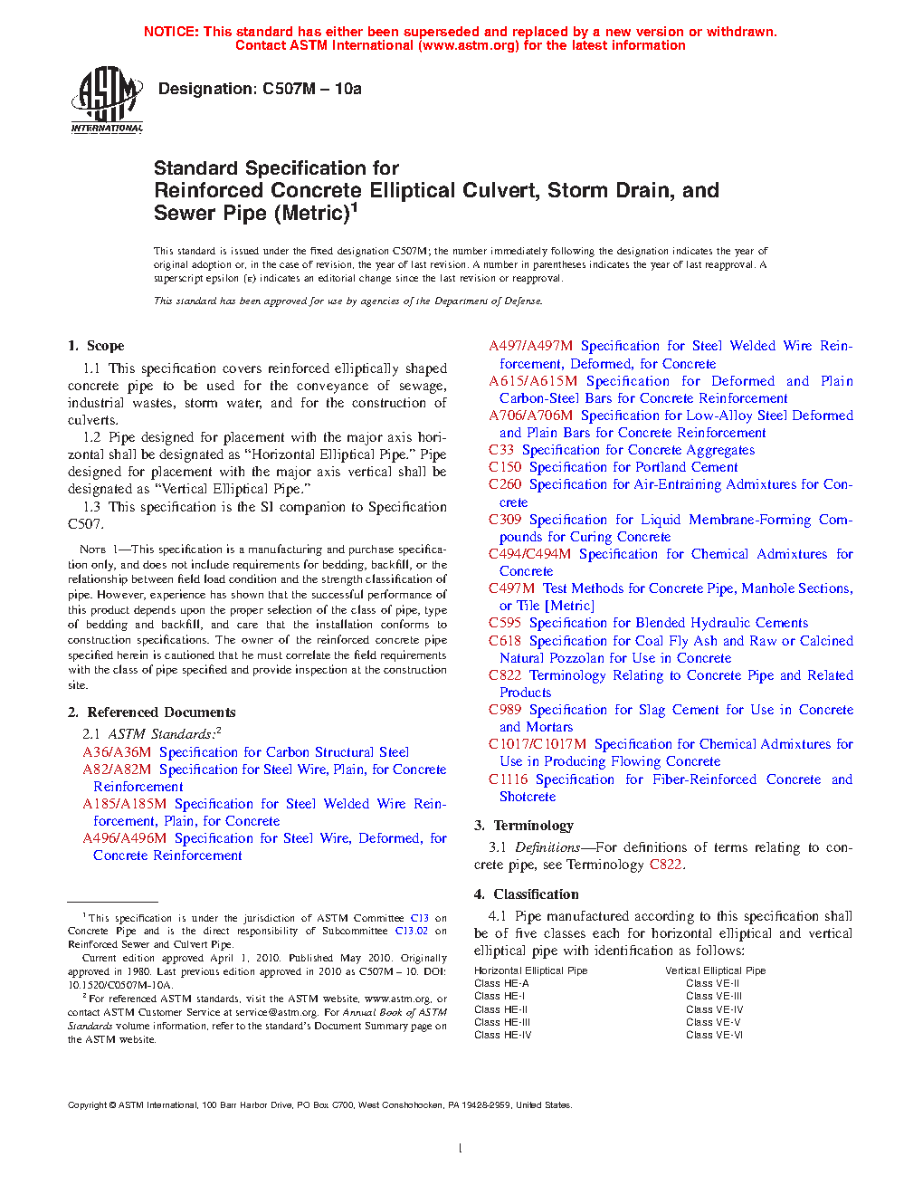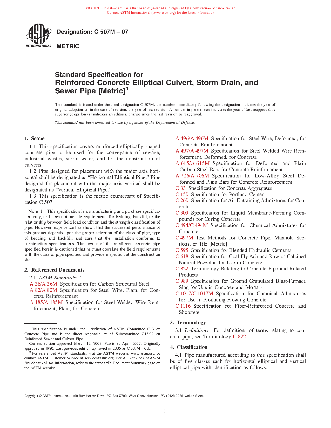 1.3 This specification is the SI companion to Specification C507; therefore, no inch-pound equivalents are presented in this specification. Reinforced concrete pipe that conforms to the requirements of C507 are acceptable under this Specification C507M unless prohibited by the owner.