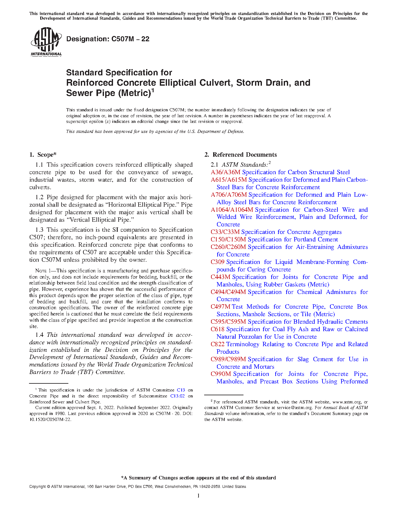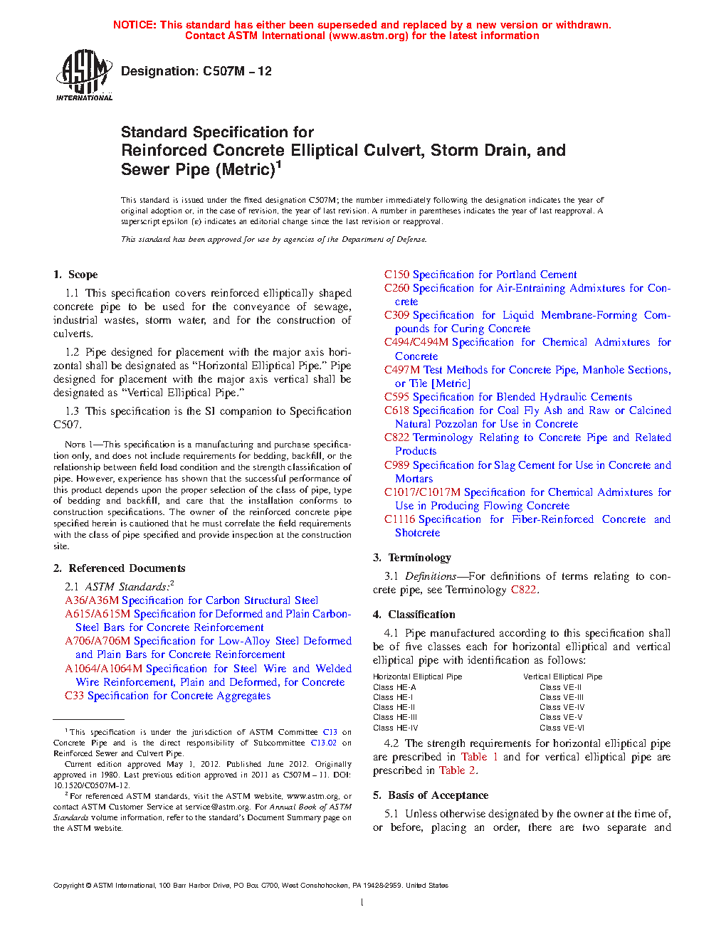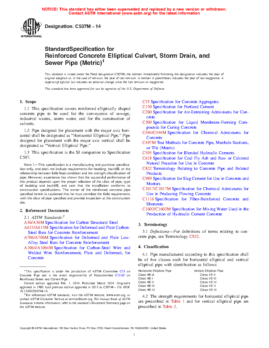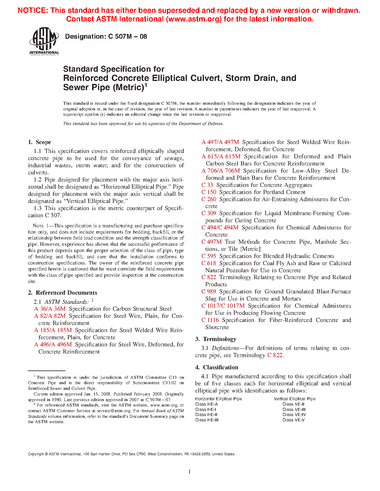 1.3 This specification is the SI companion to Specification C507; therefore, no inch-pound equivalents are presented in this specification. Reinforced concrete pipe that conforms to the requirements of C507 are acceptable under this Specification C507M unless prohibited by the owner.