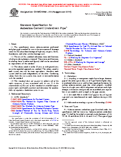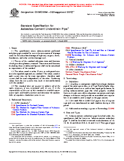 1.1 This specification covers asbestos-cement perforated and plain pipe intended for use in the conveyance of drainage water for the subsurface drainage of highways, airports, farms, foundations, and other similar drainage work.