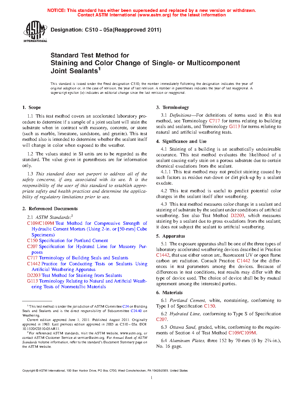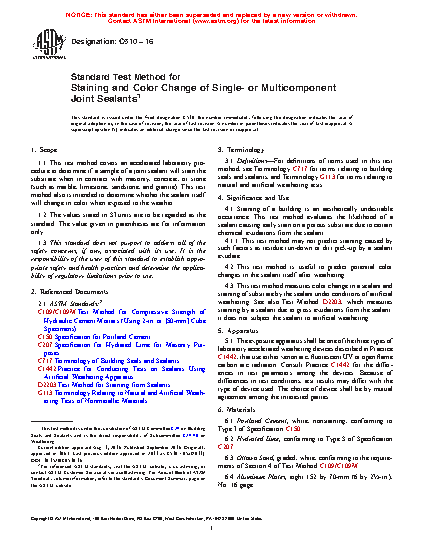 1.1 This test method describes an accelerated laboratory procedure to determine if a sample of a joint sealant will stain the substrate when in contract with masonry, concrete, or stone (such as marble, limestone, sandstone, and granite). This test method also is intended to determine whether the sealant itself will change in color when exposed to the weather.