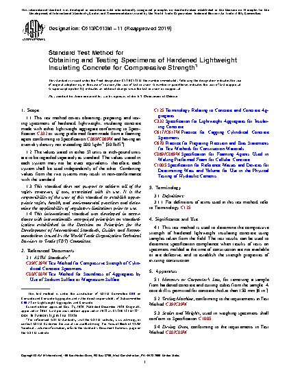 1.1 This test method covers obtaining, preparing, and testing specimens of hardened, lightweight, insulating concrete made with either lightweight aggregate conforming to Specification C332 or using preformed foam made from a foaming agent conforming to Specification C869/C869M and having an oven-dry density not exceeding 800 kg/m3 [50 lb/ft3].