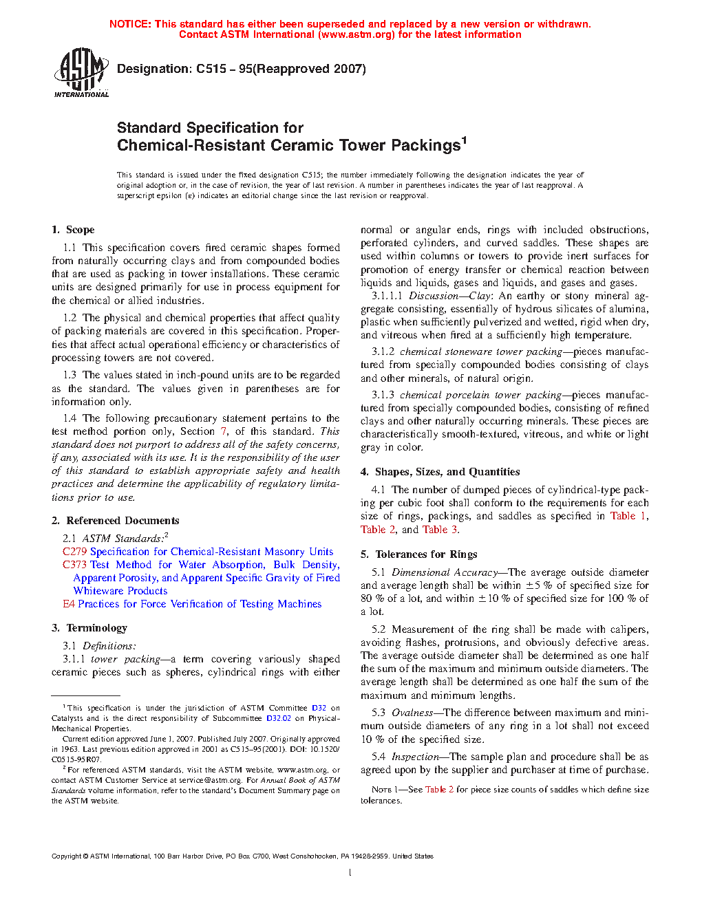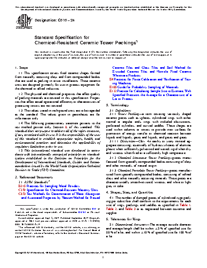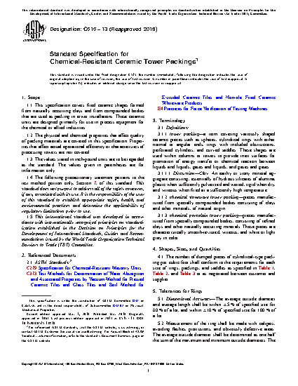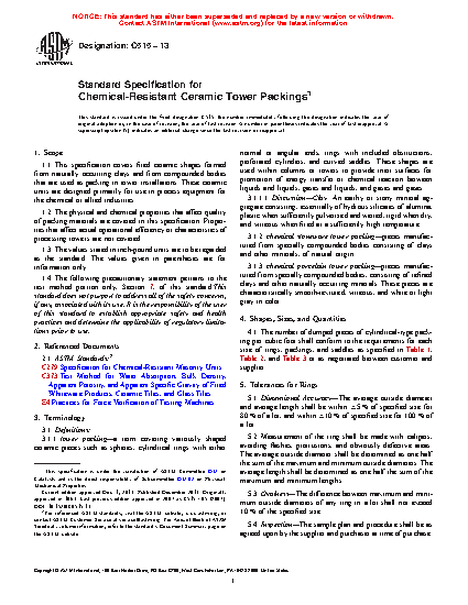 1.1 This specification covers fired ceramic shapes formed from naturally occurring clays and from compounded bodies that are used as packing in tower installations. These ceramic units are designed primarily for use in process equipment for the chemical or allied industries.