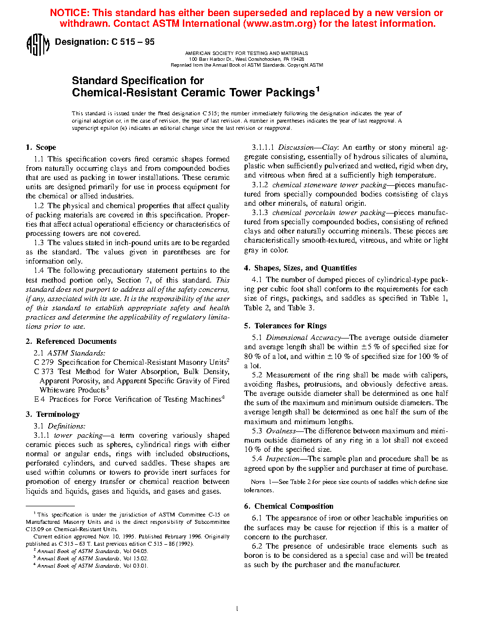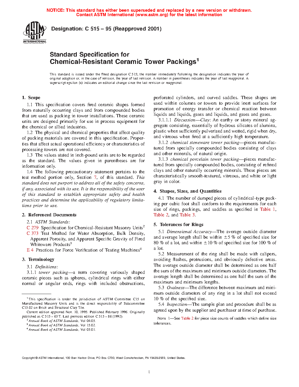 This specification covers fired chemical-resistant ceramic tower installation packings formed from naturally occurring clays or compounded bodies. The number of dumped pieces of cylindrical-type packing material should conform to the requirements for each ring, packing, and saddle size. Material properties such as crushing strength, water absorption, and acid resistance should also fall within the given values for both porcelain and stoneware packings.