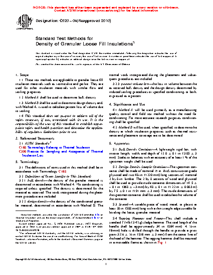 1.1 These test methods are applicable to granular loose fill insulation materials such as vermiculite and perlite. They are used for other insulation materials with similar flow and settling properties.