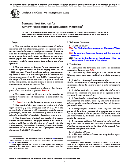 1.1 This test method covers the measurement of airflow resistance and the related measurements of specific airflow resistance and airflow resistivity of porous materials that can be used for the absorption and attenuation of sound. Materials cover a range from thick boards or blankets to thin mats, fabrics, papers, and screens. When the material is anisotropic, provision is made for measurements along different axes of the specimen.