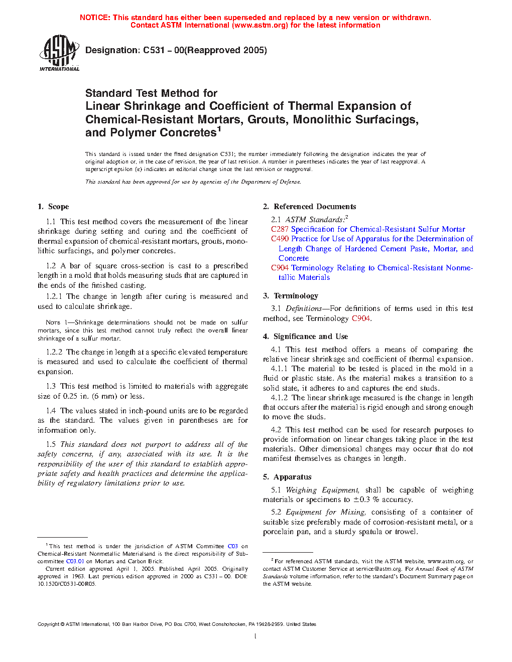 1.1 This test method covers the measurement of the linear shrinkage during setting and curing and the coefficient of thermal expansion of chemical-resistant mortars, grouts, monolithic surfacings, and polymer concretes.