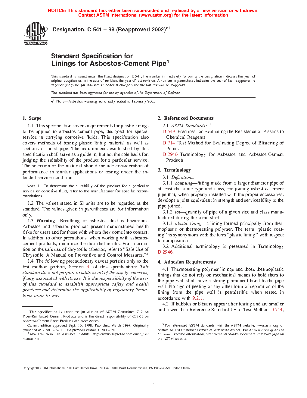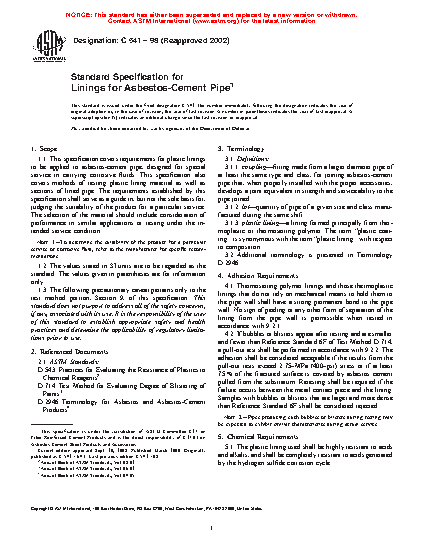 1.1 This specification covers requirements for plastic linings to be applied to asbestos-cement pipe, designed for special service in carrying corrosive fluids. This specification also covers methods of testing plastic lining material as well as sections of lined pipe. The requirements established by this specification shall serve as a guide in, but not the sole basis for, judging the suitability of the product for a particular service. The selection of the material should include consideration of performance in similar applications or testing under the intended service condition.