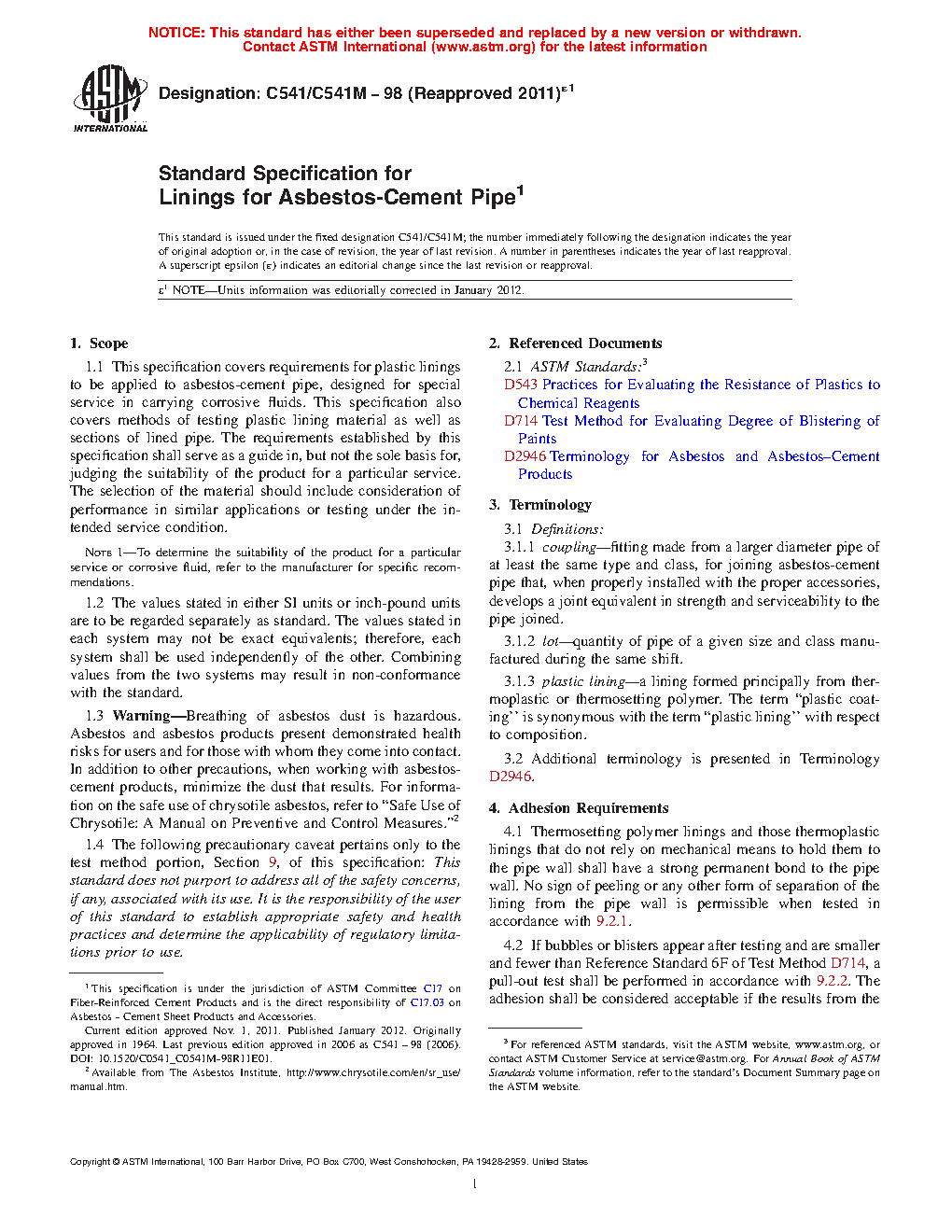 1.3 Warning—Breathing of asbestos dust is hazardous. Asbestos and asbestos products present demonstrated health risks for users and for those with whom they come into contact. In addition to other precautions, when working with asbestos-cement products, minimize the dust that results. For information on the safe use of chrysotile asbestos, refer to “Safe Use of Chrysotile: A Manual on Preventive and Control Measures.”2