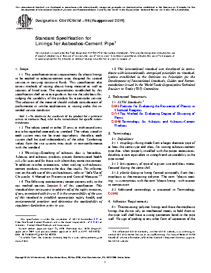 1.1 This specification covers requirements for plastic linings to be applied to asbestos-cement pipe, designed for special service in carrying corrosive fluids. This specification also covers methods of testing plastic lining material as well as sections of lined pipe. The requirements established by this specification shall serve as a guide in, but not the sole basis for, judging the suitability of the product for a particular service. The selection of the material should include consideration of performance in similar applications or testing under the intended service condition.