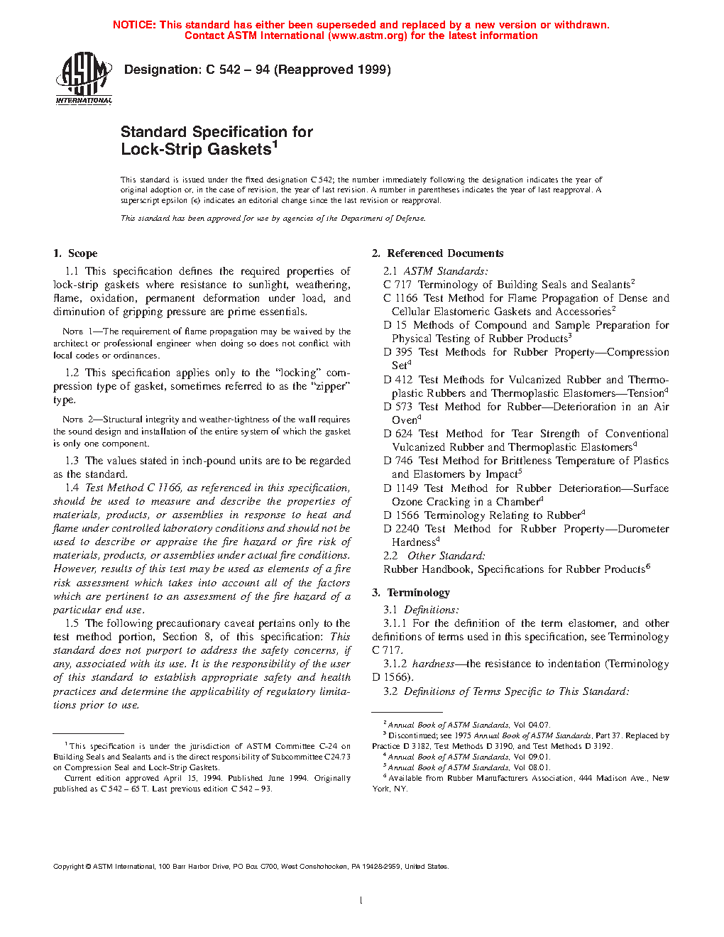 1.1 This specification defines the required properties of lock-strip gaskets where resistance to sunlight, weathering, flame, oxidation, permanent deformation under load, and diminution of gripping pressure are prime essentials.