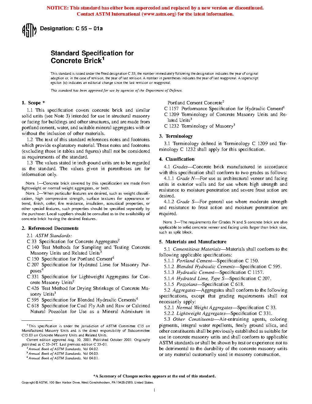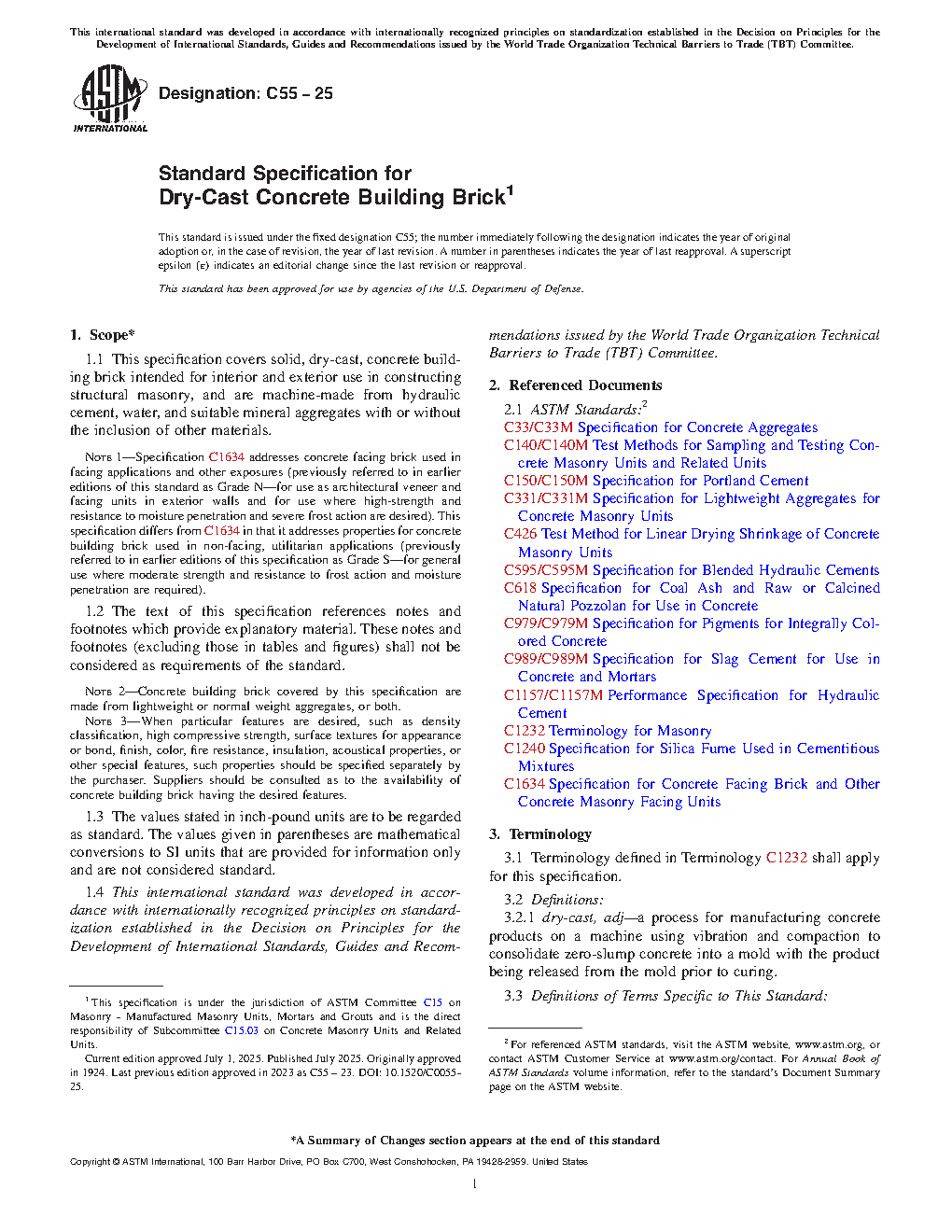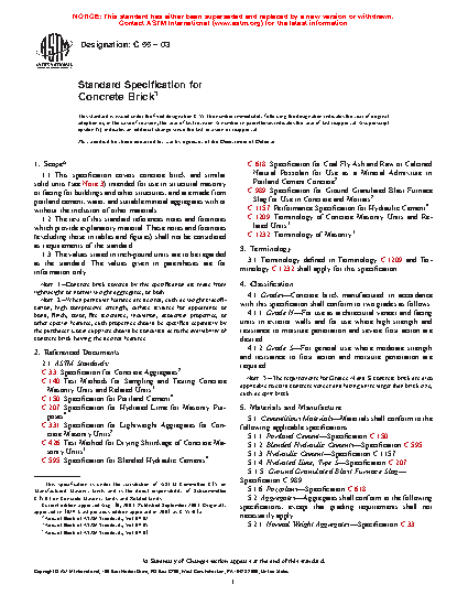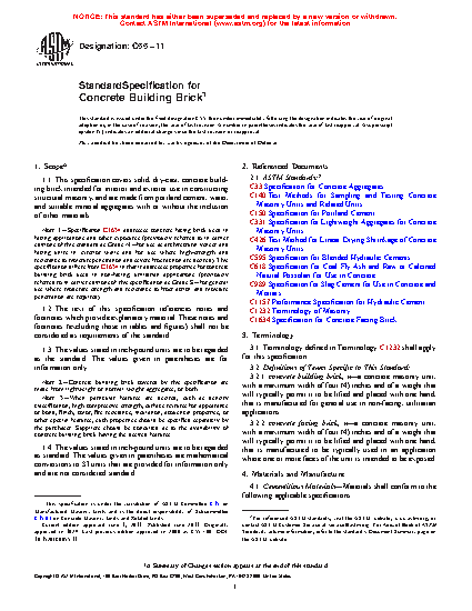 1.1 This specification covers solid, dry-cast, concrete building brick intended for interior and exterior use in constructing structural masonry, and are made from portland cement, water, and suitable mineral aggregates with or without the inclusion of other materials.