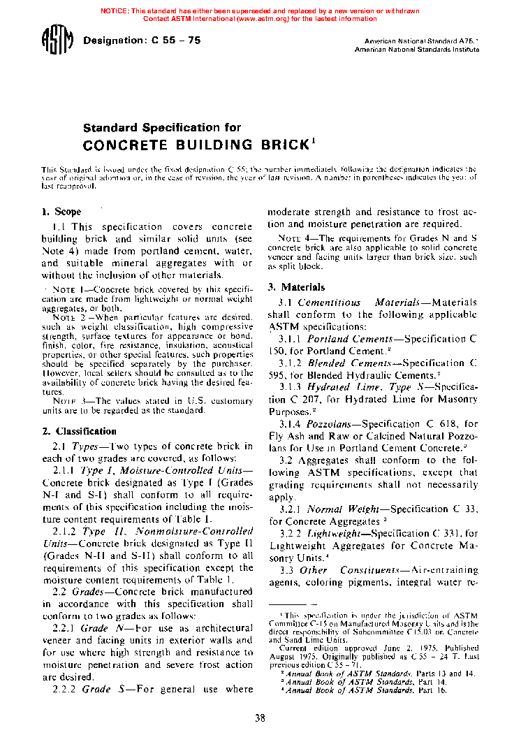 Note 1: Specification C1634 addresses concrete facing brick used in facing applications and other exposures (previously referred to in earlier editions of this standard as Grade N—for use as architectural veneer and facing units in exterior walls and for use where high-strength and resistance to moisture penetration and severe frost action are desired). This specification differs from C1634 in that it addresses properties for concrete building brick used in non-facing, utilitarian applications (previously referred to in earlier editions of this specification as Grade S—for general use where moderate strength and resistance to frost action and moisture penetration are required).