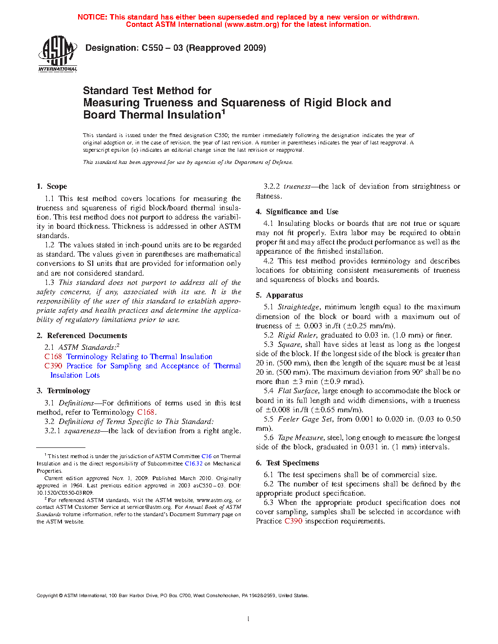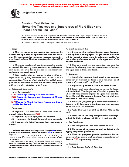 1.1 This test method covers locations for measuring the trueness and squareness of rigid block/board thermal insulation. This test method does not purport to address the variability in board thickness. Thickness is addressed in other ASTM standards.