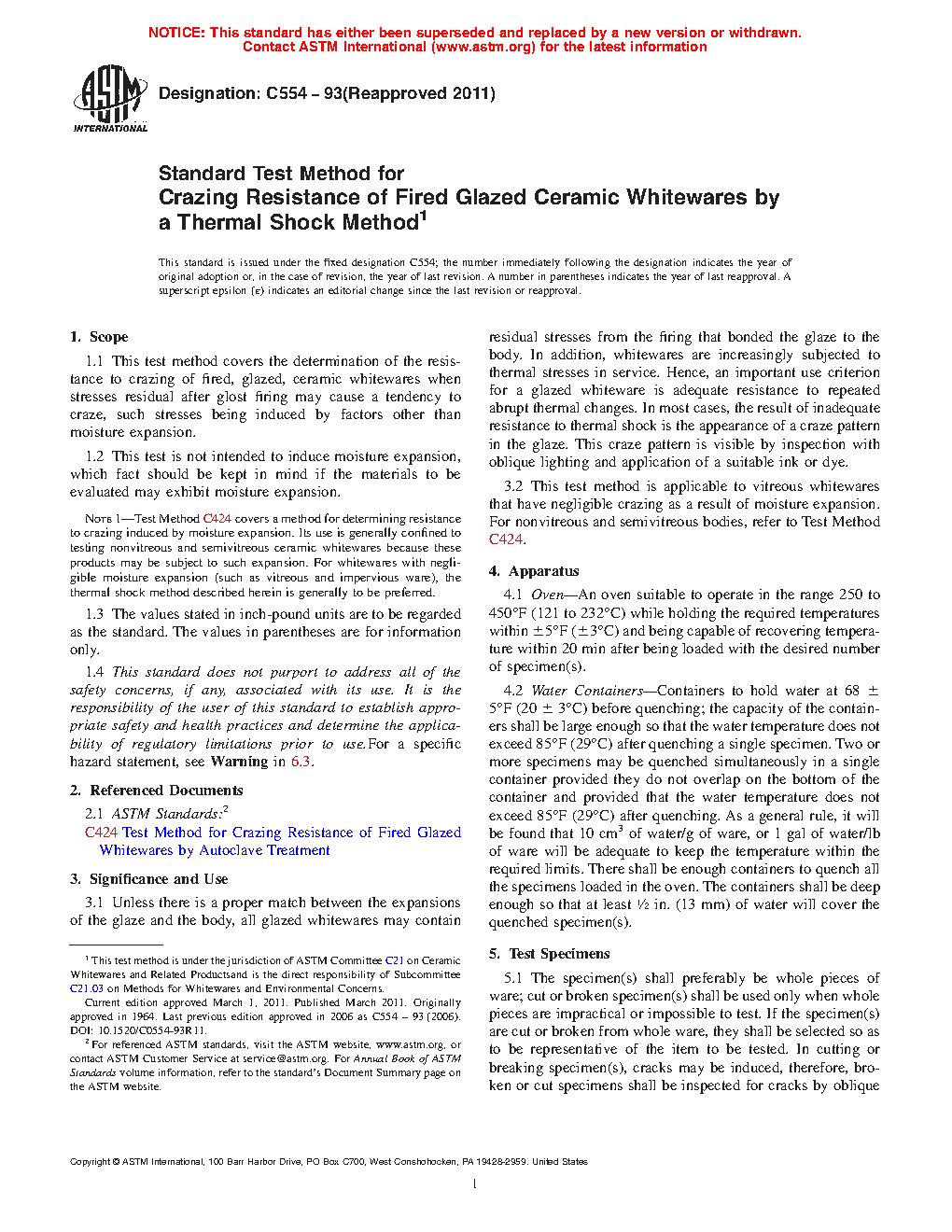 1.2 This test is not intended to induce moisture expansion, which fact should be kept in mind if the materials to be evaluated may exhibit moisture expansion. Note 1Test Method C 424 covers a method for determining resistance to crazing induced by moisture expansion. Its use is generally confined to testing nonvitreous and semivitreous ceramic whitewares because these products may be subject to such expansion. For whitewares with negligible moisture expansion (such as vitreous and impervious ware), the thermal shock method described herein is generally to be preferred.