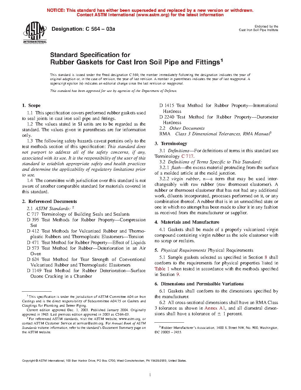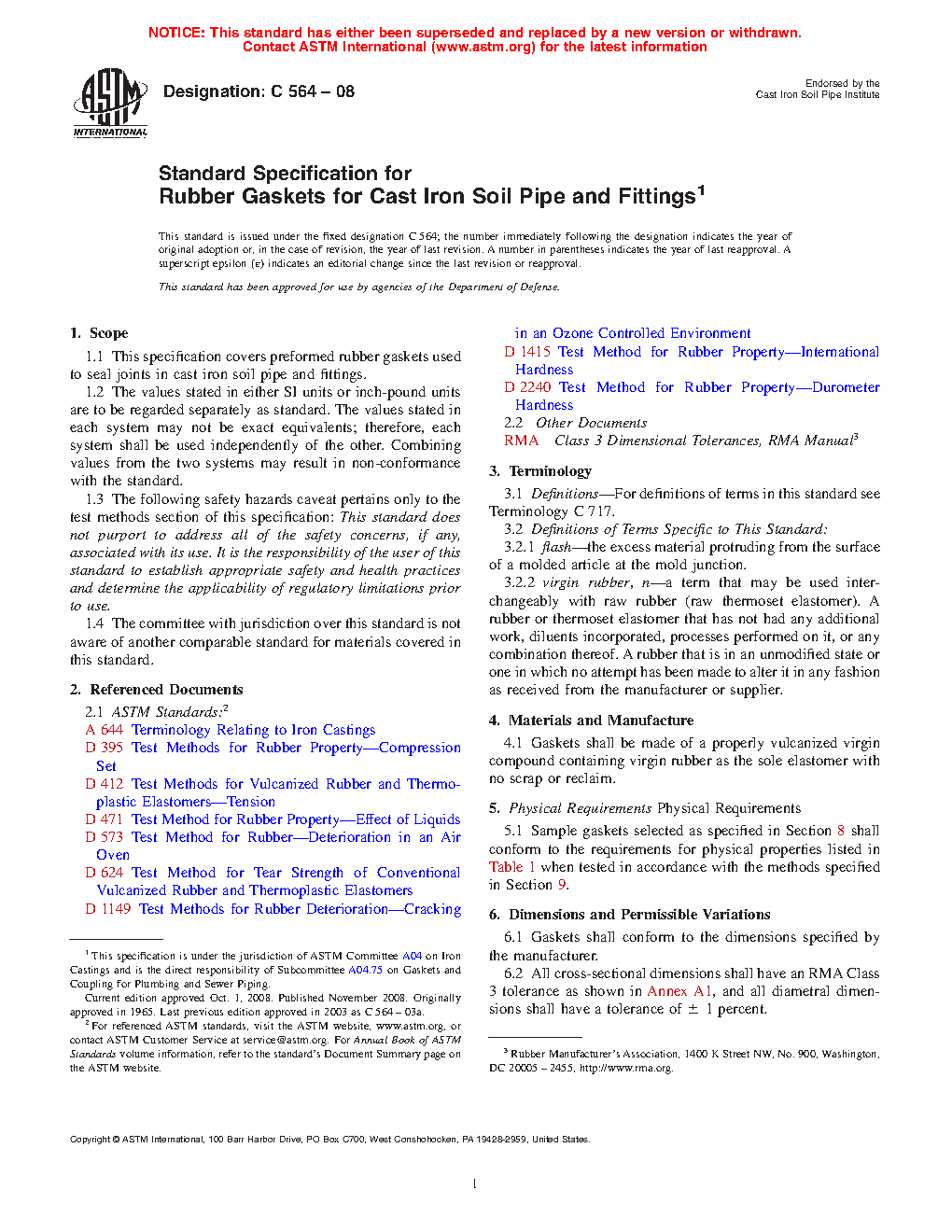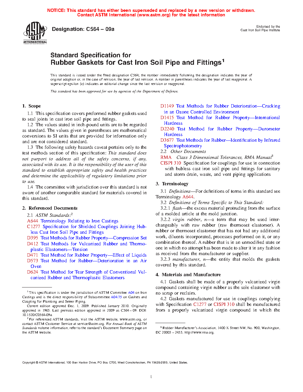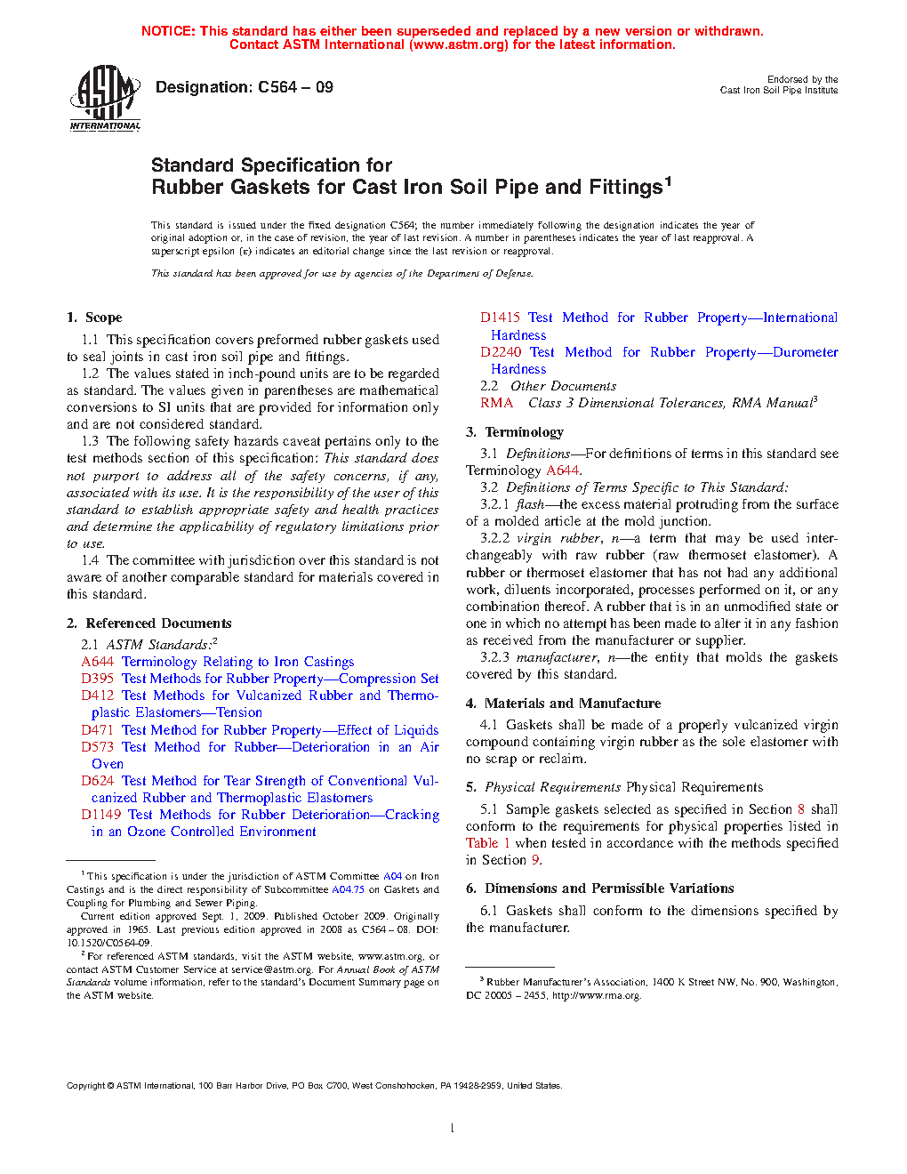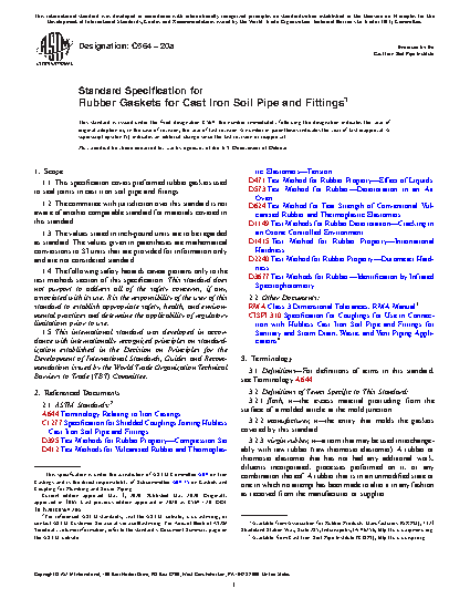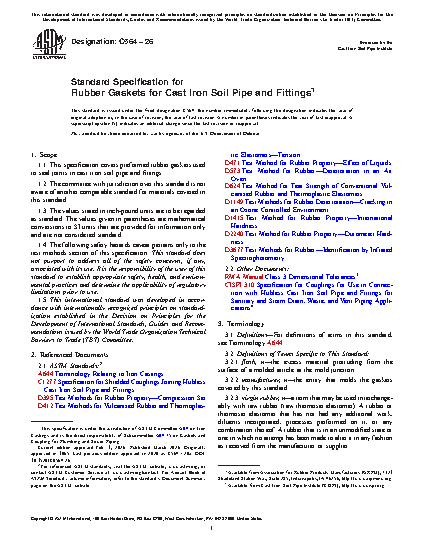 1.1 This specification covers preformed rubber gaskets used to seal joints in cast iron soil pipe and fittings.