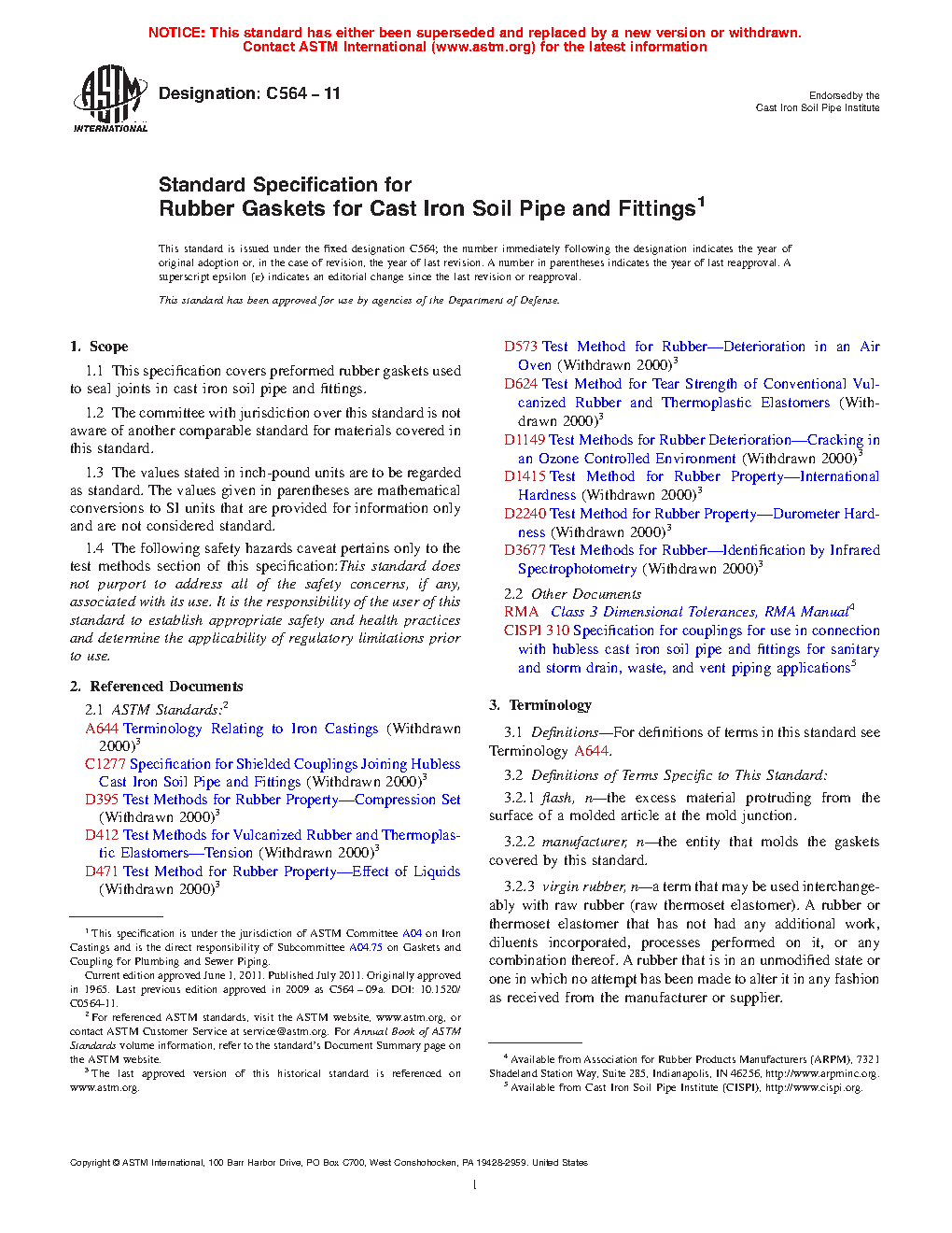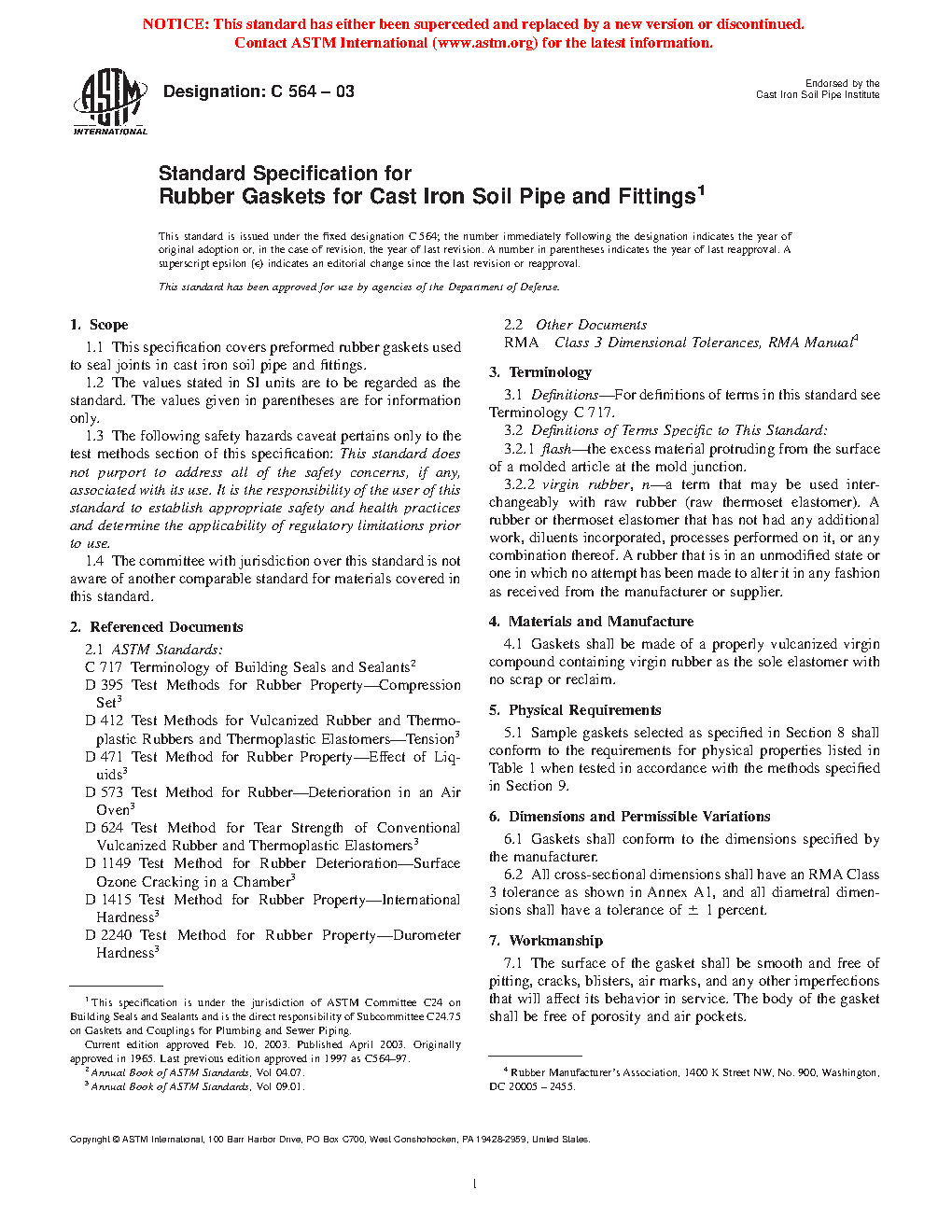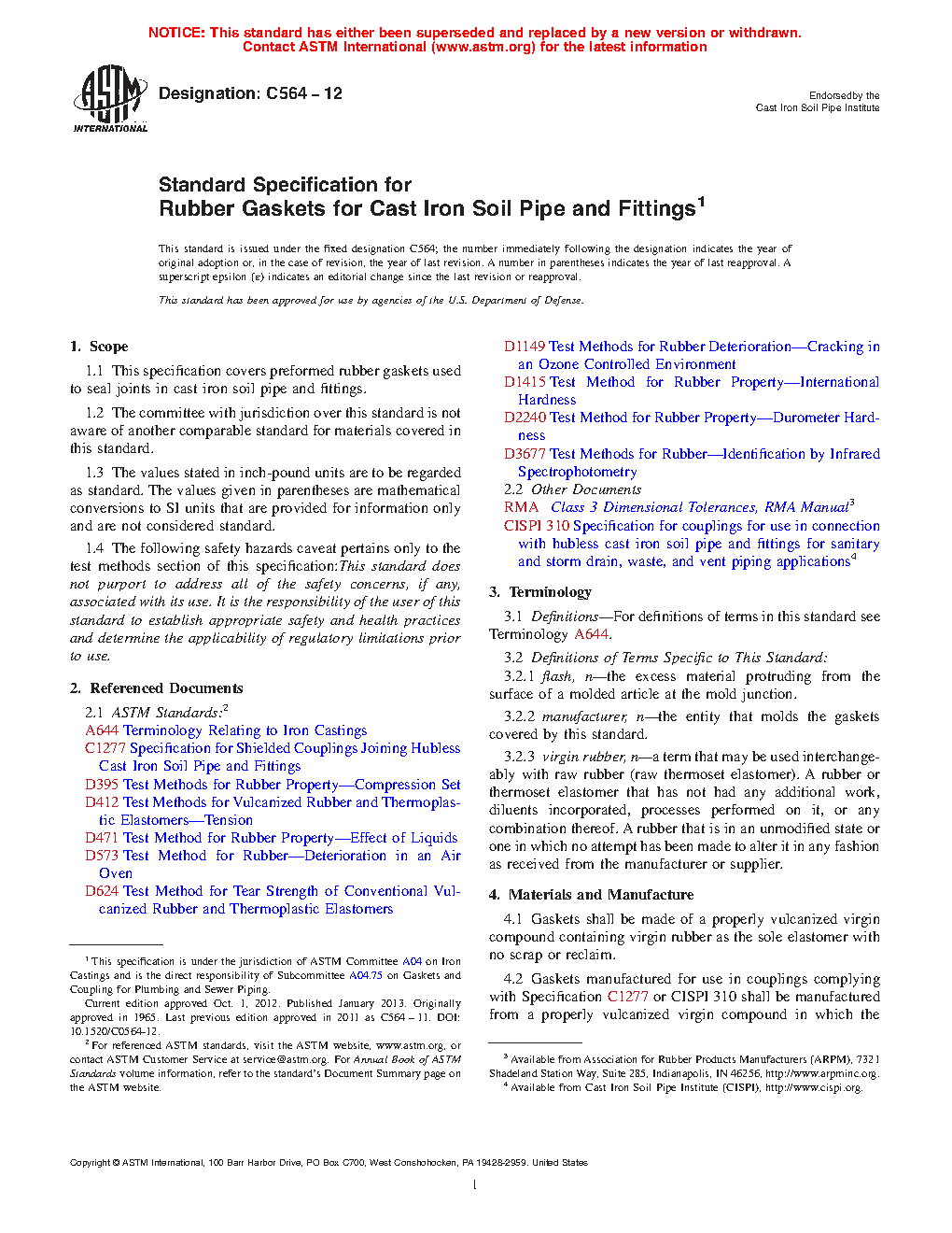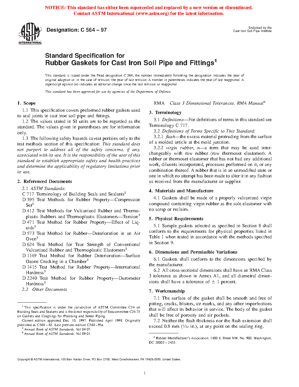 1.1 This specification covers preformed rubber gaskets used to seal joints in cast iron soil pipe and fittings.