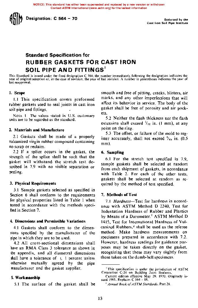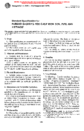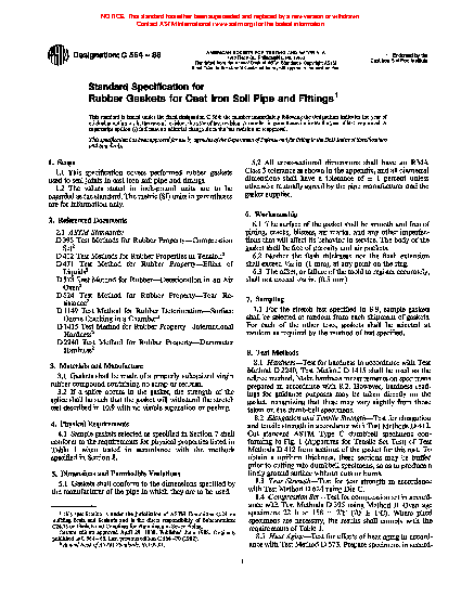 This specification covers preformed rubber gaskets used to seal joints in cast iron soil pipe and fittings. Gaskets shall be made of a properly vulcanized virgin rubber as the sole elastomer with no scrap or reclaim. Gaskets shall conform to the required physical properties such as hardness, elongation, tensile strength, tear strength and compression. The gasket material shall be tested for effects of heat aging. They shall be tested for weight increase due to water absorption and shall also be tested for volume decrease due to oil absorption. Gasket material shall be tested for ozone resistance.