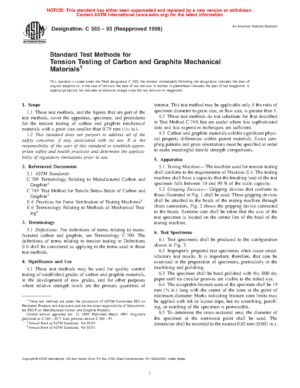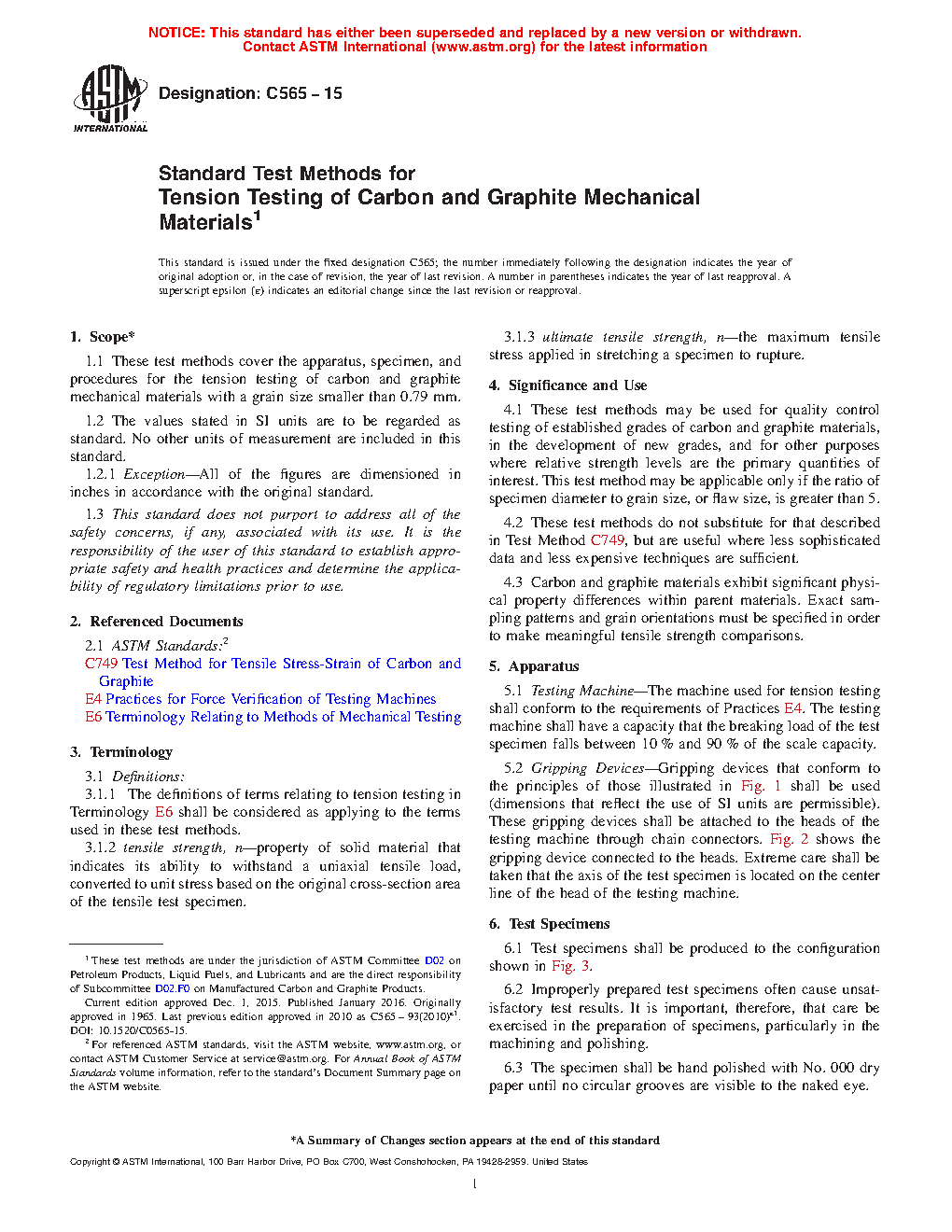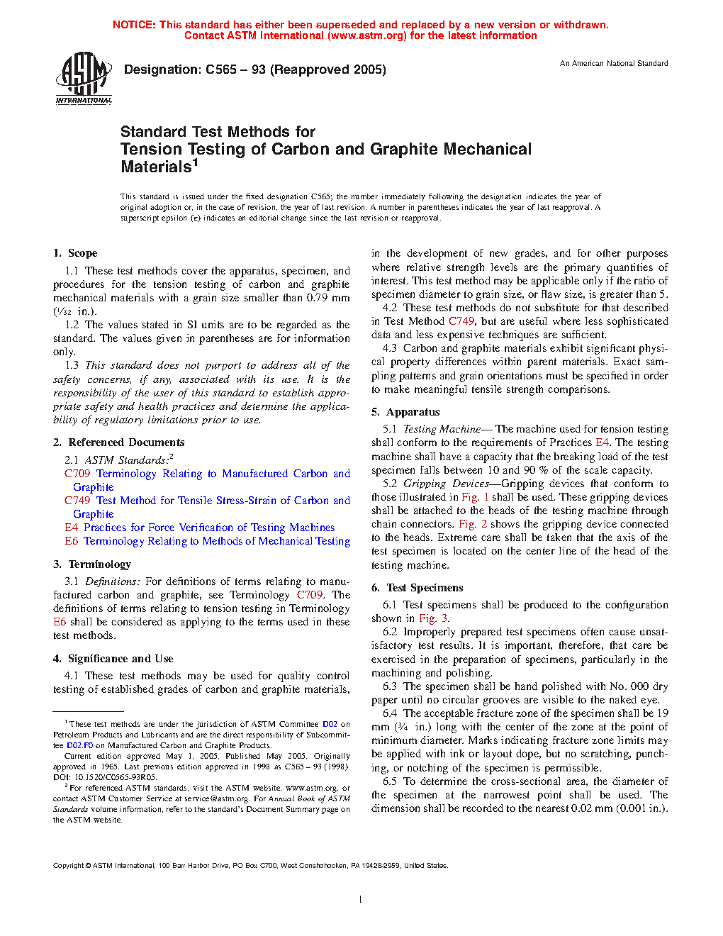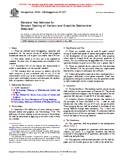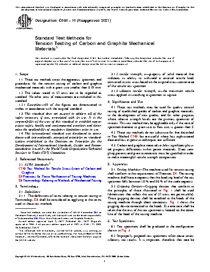 1.1 These test methods cover the apparatus, specimen, and procedures for the tension testing of carbon and graphite mechanical materials with a grain size smaller than 0.79 mm.