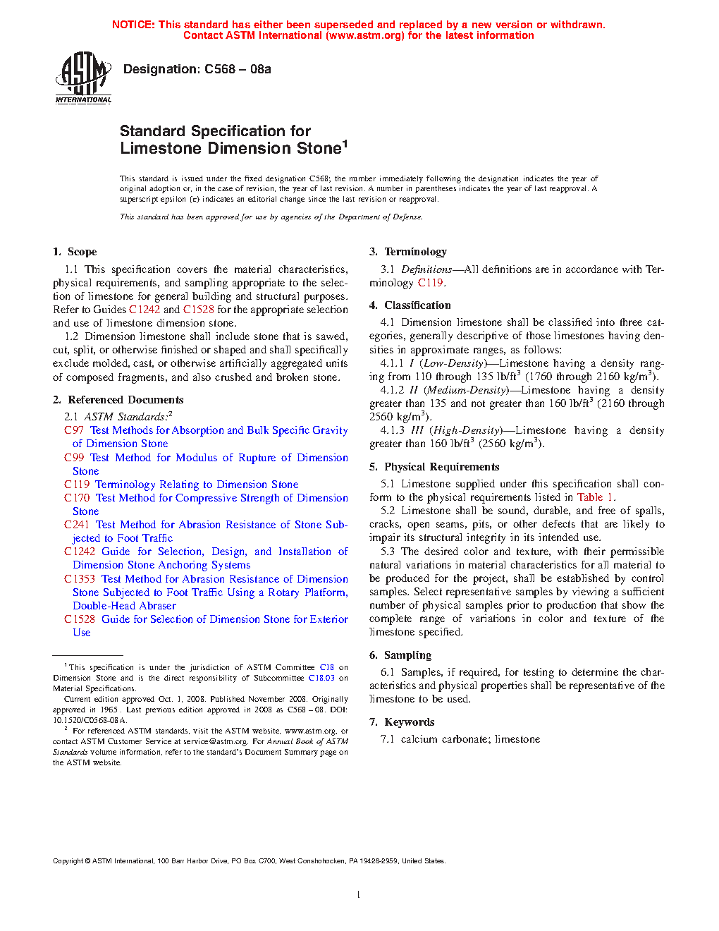 1.1 This specification covers the material characteristics, physical requirements, and sampling appropriate to the selection of limestone for general building and structural purposes. Refer to Guides C1242 and C1528 for the appropriate selection and use of limestone dimension stone.