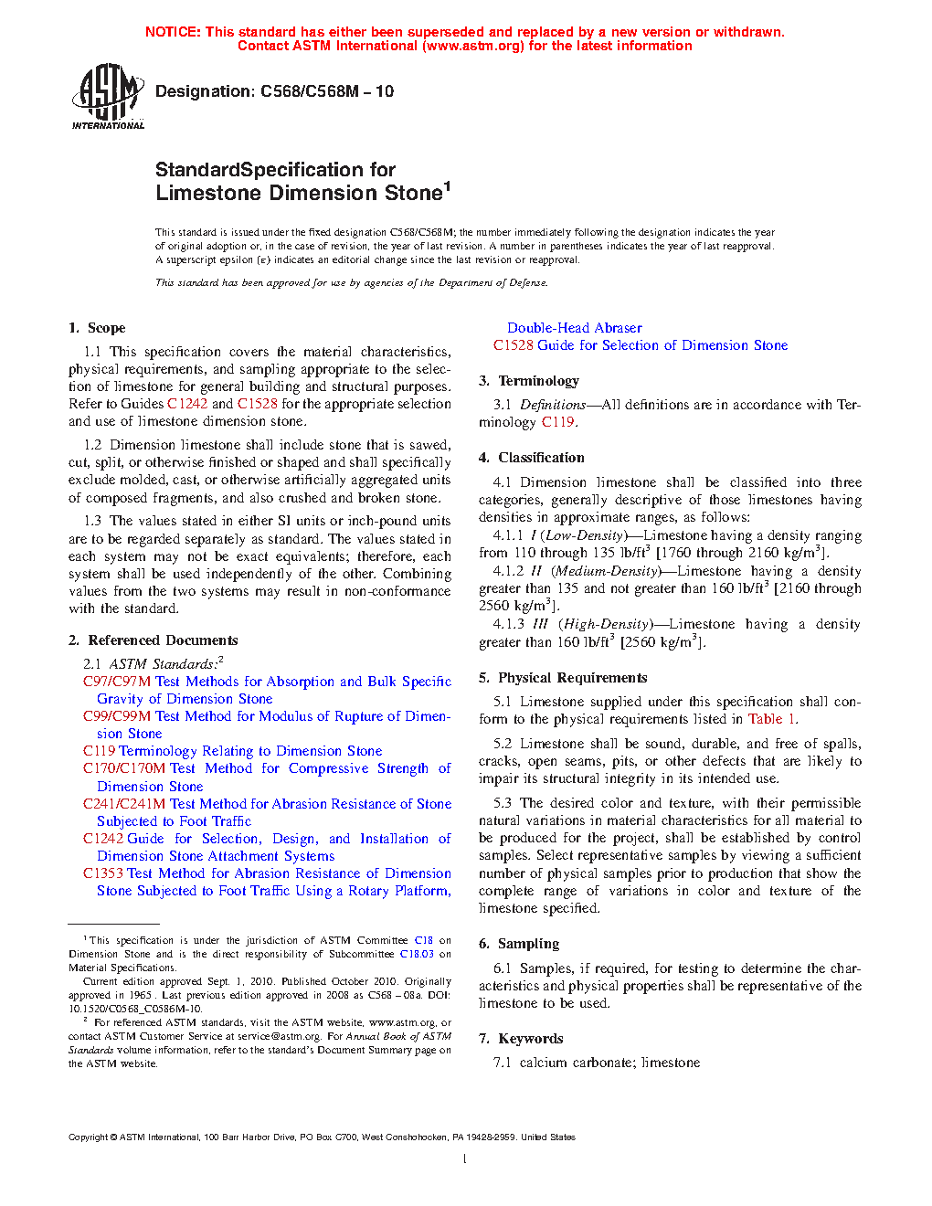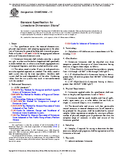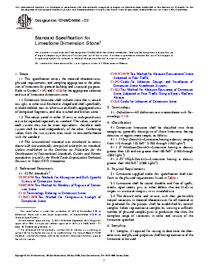 1.1 This specification covers the material characteristics, physical requirements, and sampling appropriate to the selection of limestone for general building and structural purposes. Refer to Guides C1242 and C1528 for the appropriate selection and use of limestone dimension stone.