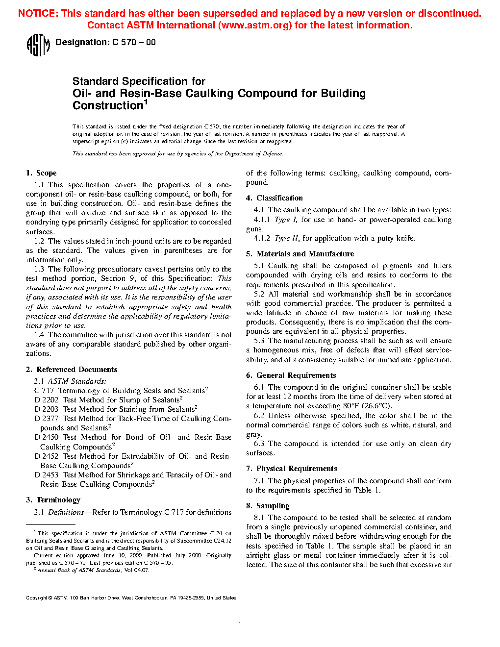 1.1 This specification covers the properties of a one-component oil- or resin-base caulking compound, or both, for use in building construction. Oil- and resin-base defines the group that will oxidize and surface skin as opposed to the nondrying type primarily designed for application to concealed surfaces.