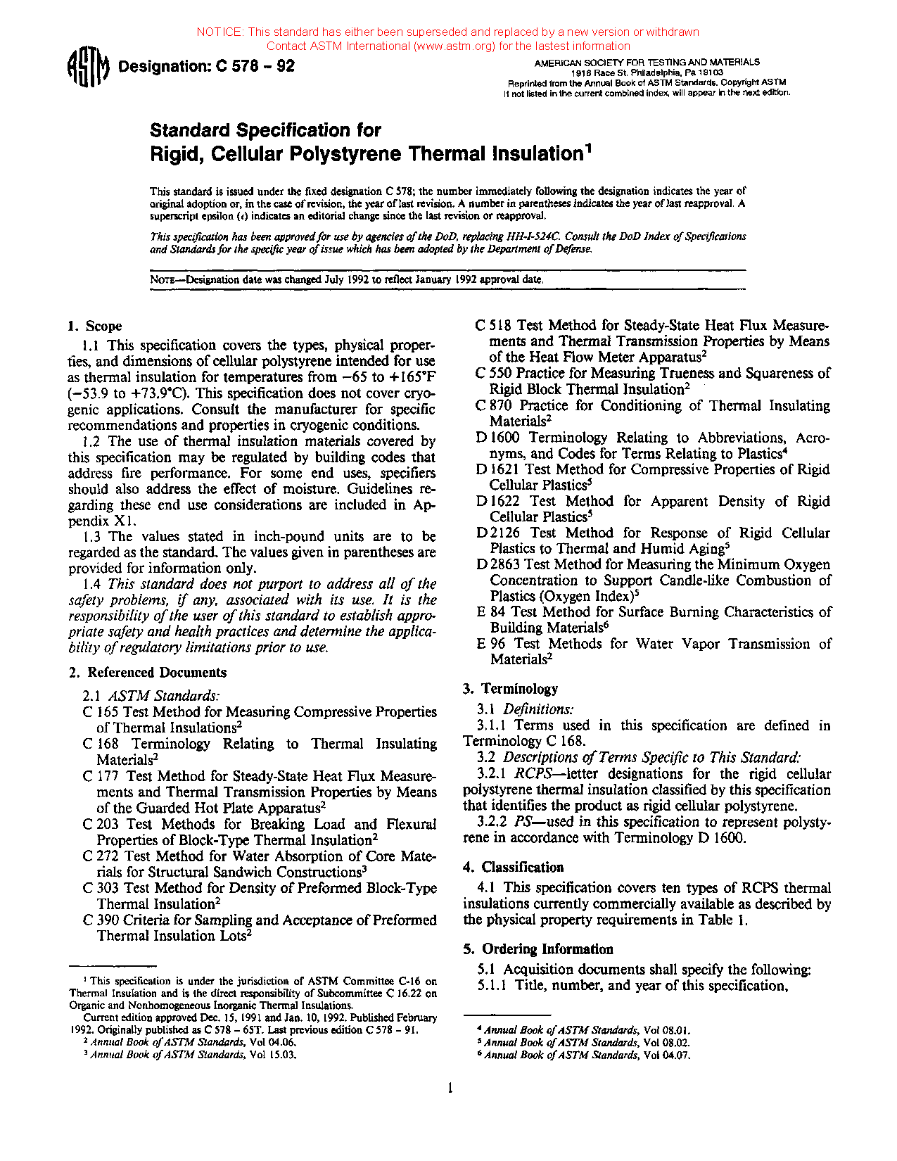 This specification covers the standards for the types, physical properties and dimensions of cellular polystyrene boards with or without facings or coatings made by molding (EPS) or extrusion (XPS) of expandable polystyrene proposed for use as thermal insulation. This specification, however, does not cover laminated products manufactured with any type of rigid board facer including fiberboard, perlite board, gypsum board, or oriented strand board. All thermal insulation shall be of uniform density and shall contain sufficient flame retardants to meet the oxygen index of requirements. They shall also meet the physical requirements such as thermal resistance, compressive resistance, flexural strength, water vapor permeance, water absorption, dimensional stability, and oxygen index specified herein.
