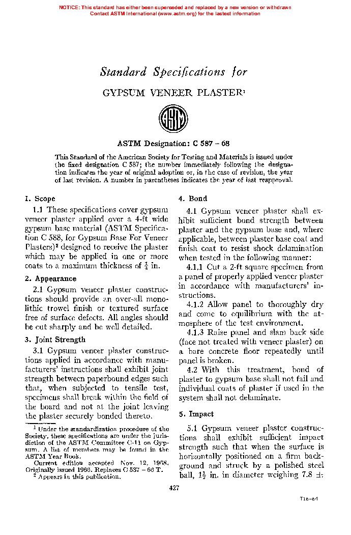 1.2 This specification covers test methods for determining the physical properties of gypsum veneer plasters and sets forth minimum requirements that must be met.