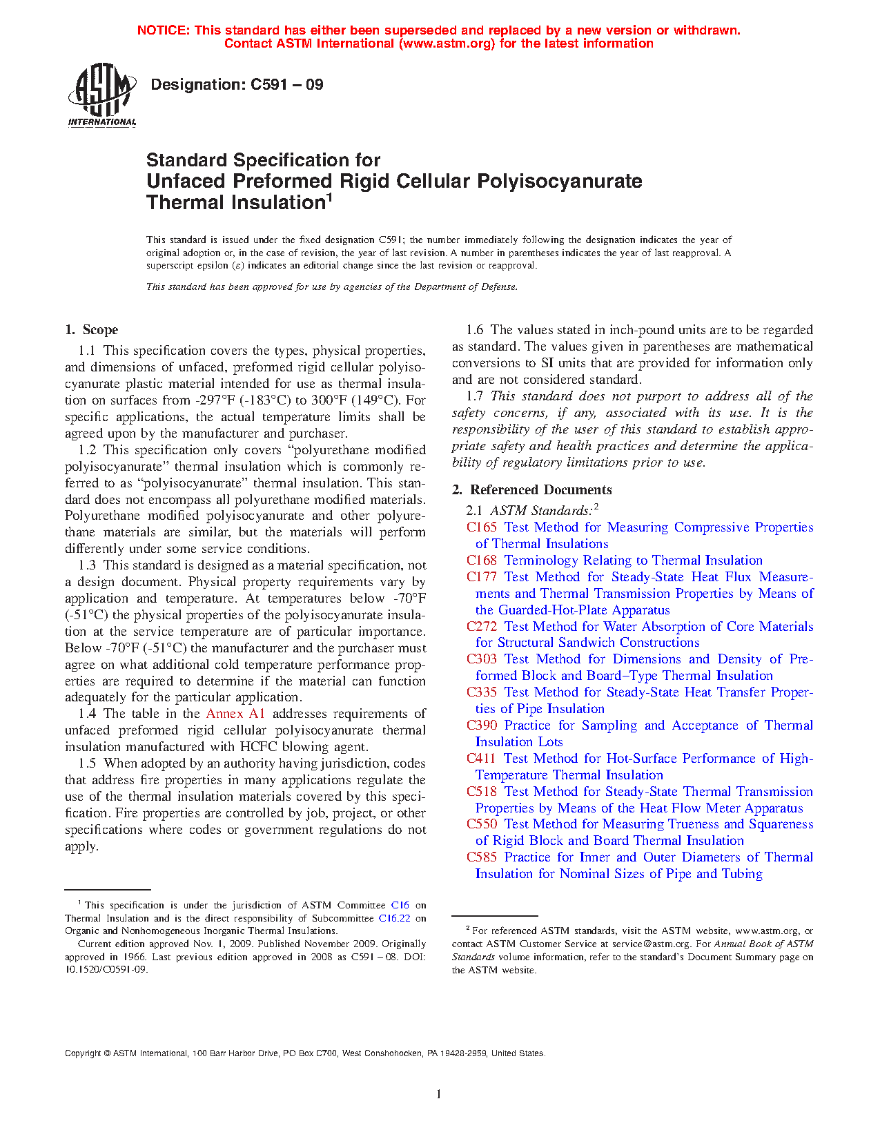 1.1 This specification covers the types, physical properties, and dimensions of unfaced, preformed rigid cellular polyisocyanurate plastic material intended for use as thermal insulation on surfaces from 297°F (183°C) to 300°F (150°C). For specific applications, the actual temperature limits shall be agreed upon by the manufacturer and purchaser.