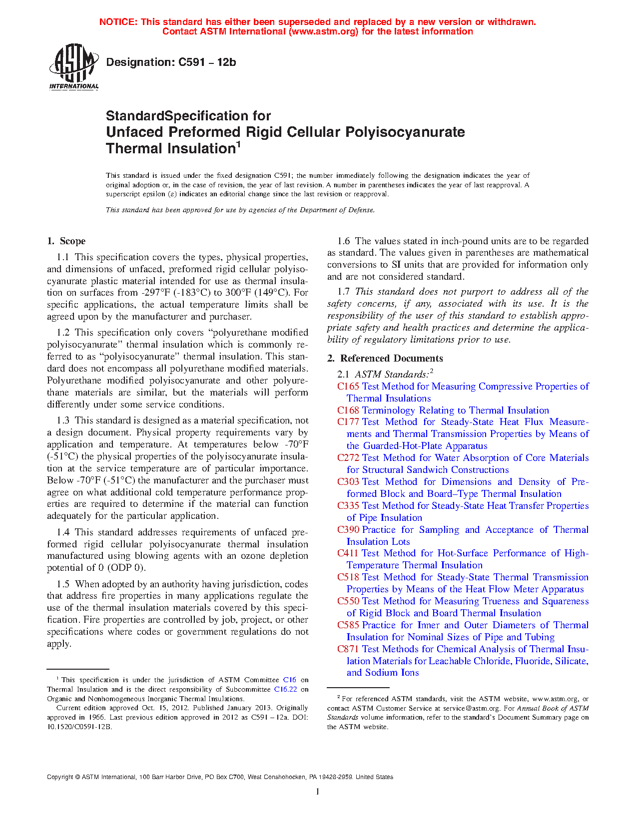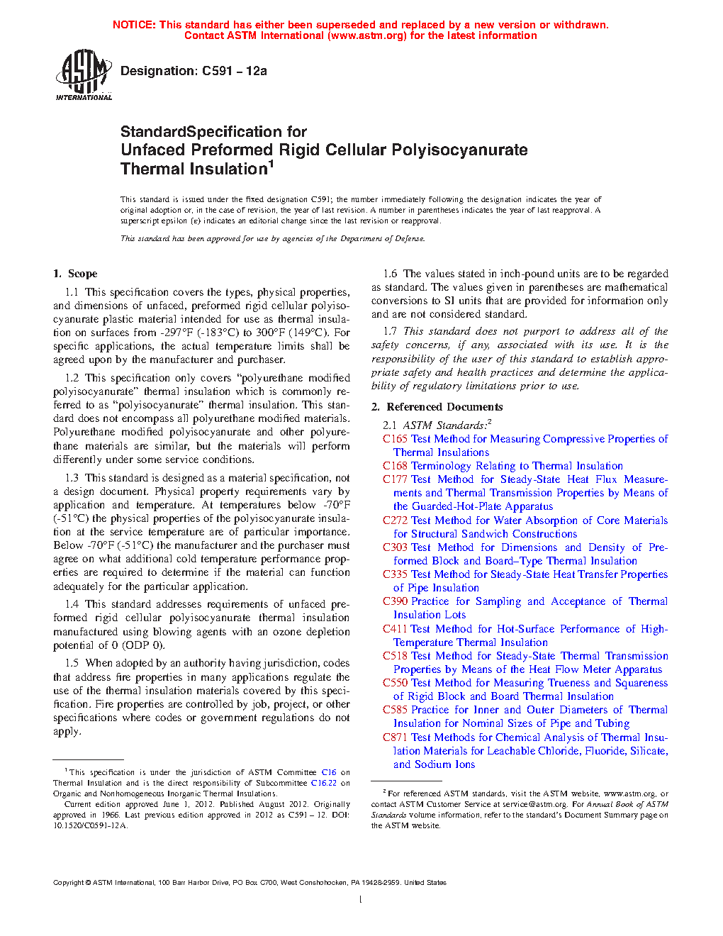 1.4 This standard addresses requirements of unfaced preformed rigid cellular polyisocyanurate thermal insulation manufactured using blowing agents with an ozone depletion potential of 0 (ODP 0).
