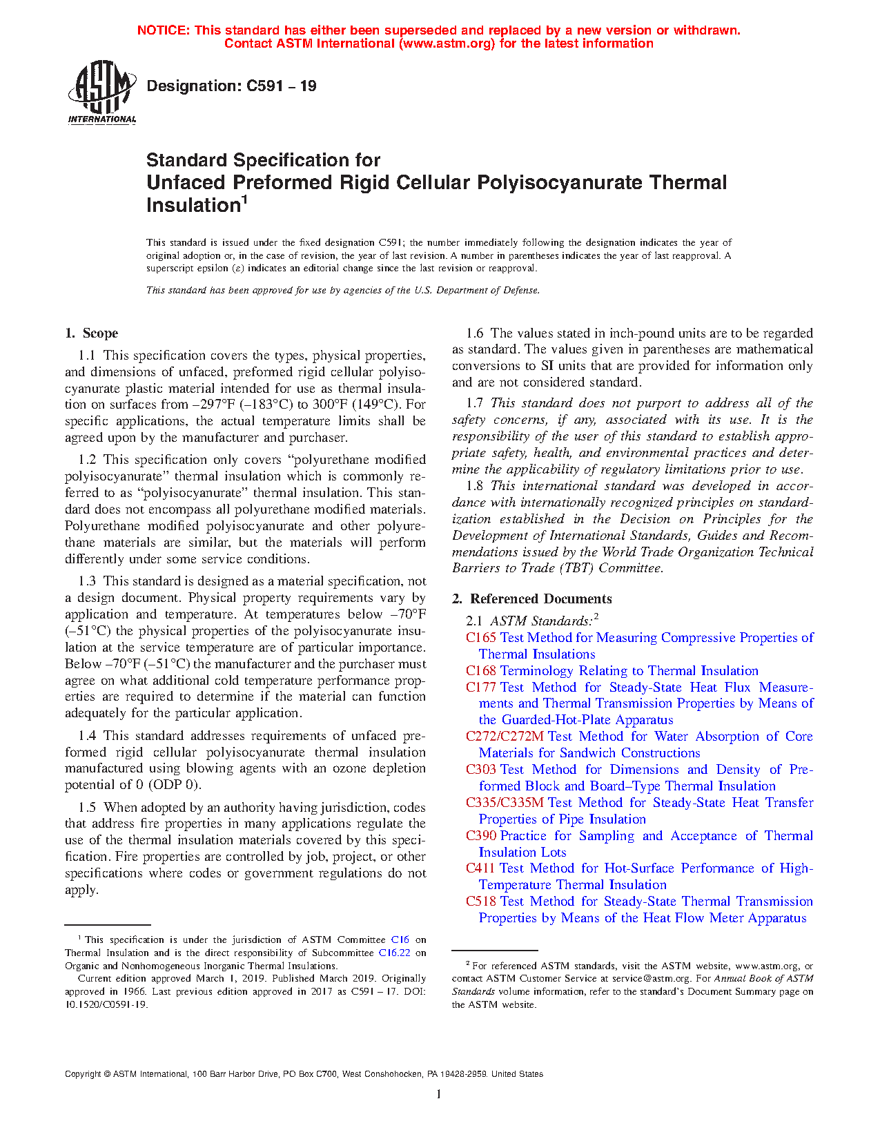 1.4 This standard addresses requirements of unfaced preformed rigid cellular polyisocyanurate thermal insulation manufactured using blowing agents with an ozone depletion potential of 0 (ODP 0).