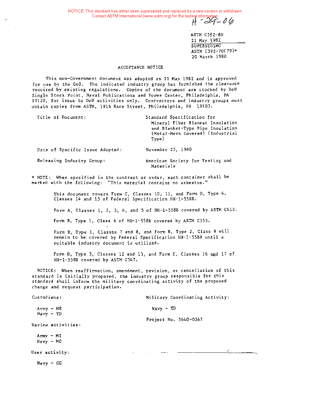 This specification covers mineral fiber blanket insulation and blanket-type pipe insulation (metal-mesh covered) (industrial type). Mineral fiber metal-mesh covered blanket shall be composed of rock, slag, or glass processed from the molten state into fibrous form, bonded with or without an organic binder, and secured with metallic supporting facing(s). Types of facings for one or both sides of blanket units shall be specified. When both sides are to be faced, units are permitted to have the same or different types on the two sides. Each piece of metal-mesh covered insulation shall be coherent to permit handling/transportation and installation as a unit. A detectable odor of objectionable nature recorded by more than two of the five panel members shall constitute rejection of the material. When tested and evaluated, the corrosion resulting from the unfaced insulation blanket in contact with metal plates shall be judged to be no greater than comparative plates in contact with sterile cotton. The averaged maximum shot content of mineral fiber rock or slag type products shall not exceed 30 % by weight. When tested, the blanket insulation shall not warp, flame, or glow during hot surface exposure. When tested, the blanket mid-point temperature shall not at any time exceed the hot surface temperature by more than 100°F (55.5°C). When tested, the blanket insulation shall not exceed the recorded temperature rise more than 54°F (30°C) with no flaming and weight loss exceeding 5 %.