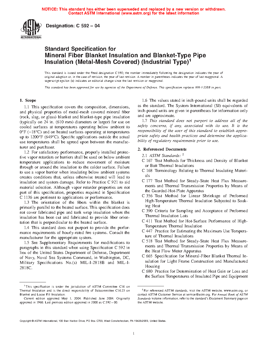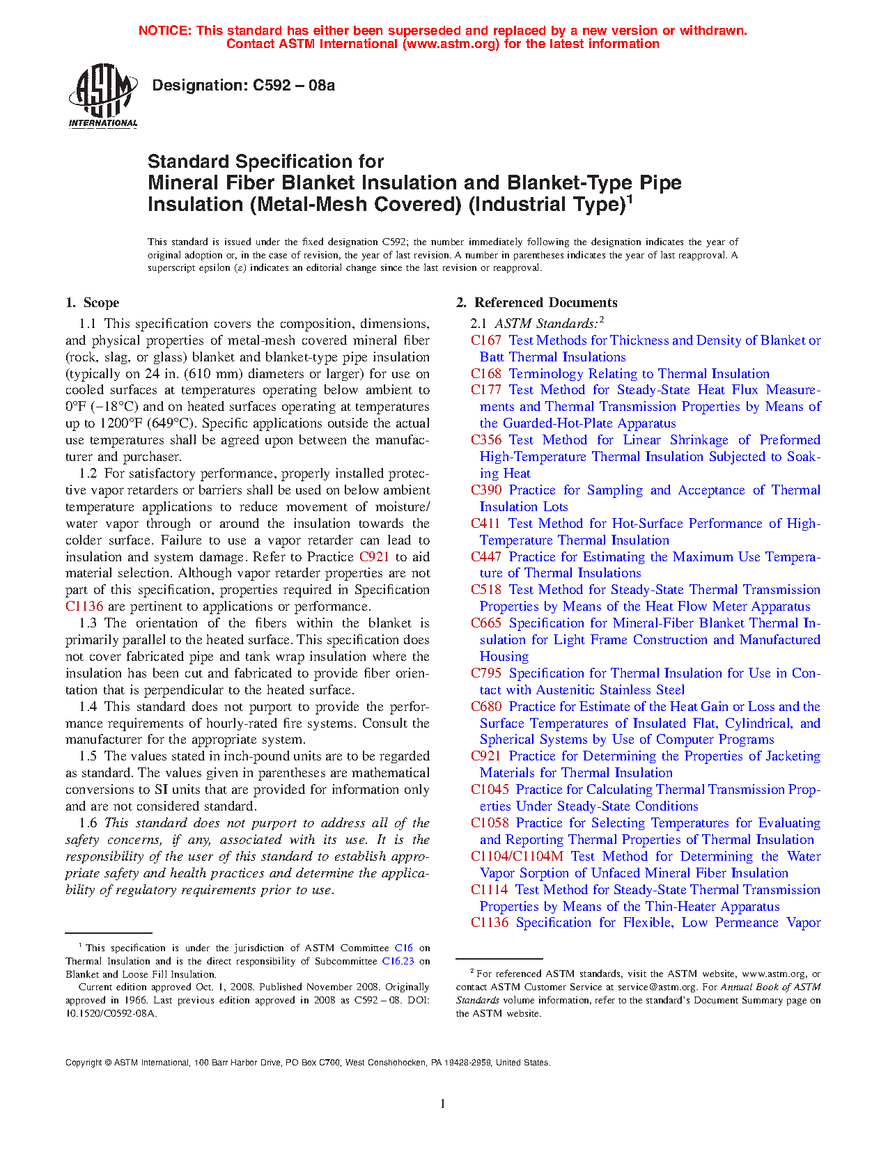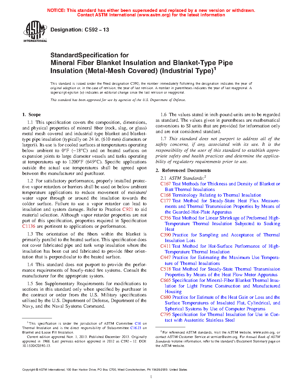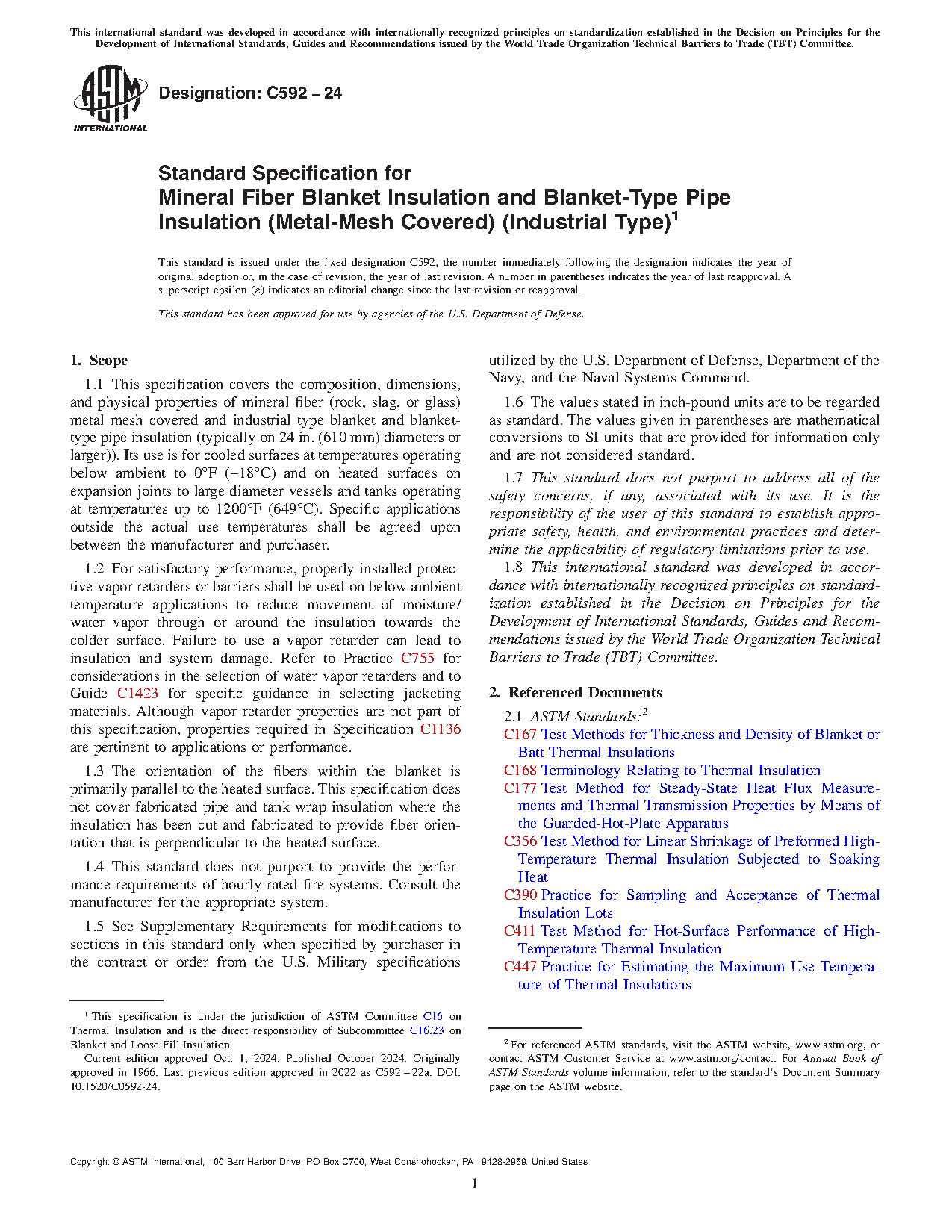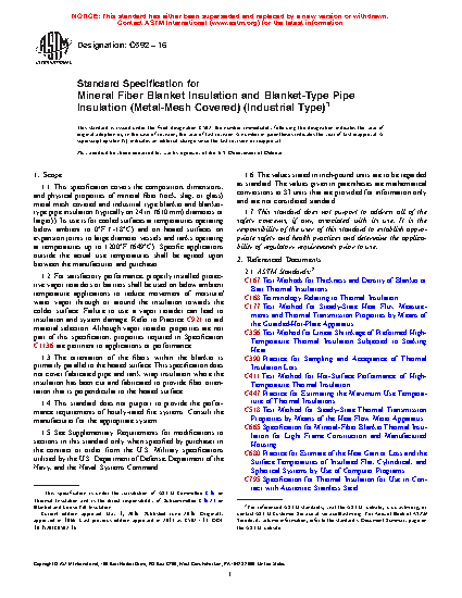 1.1 This specification covers the composition, dimensions, and physical properties of mineral fiber (rock, slag, or glass) metal mesh covered and industrial type blanket and blanket-type pipe insulation (typically on 24 in. (610 mm) diameters or larger)). Its use is for cooled surfaces at temperatures operating below ambient to 0°F (-18°C) and on heated surfaces on expansion joints to large diameter vessels and tanks operating at temperatures up to 1200°F (649°C). Specific applications outside the actual use temperatures shall be agreed upon between the manufacturer and purchaser.